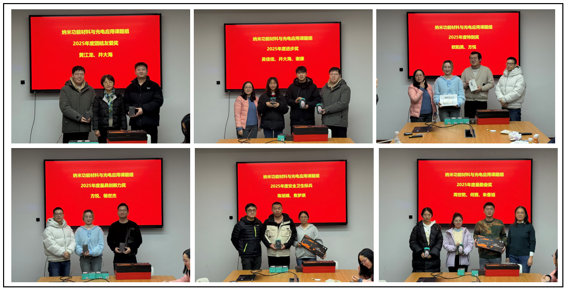 会议期间还举行了2025年度优秀学生评选及颁奖仪式。经现场民主投票,课题组对在不同方面表现突出的学生予以表彰。黄江龙、井大海因出色的团队协作精神与无私奉献的担当,荣获 “团结友爱奖”;吴佳佳、井大海、谢康在科研道路上锐意进取、奋勇争先,取得阶段性显著进步,摘得 “进步奖”;方悦、杨世杰凭借独特的创新思维与扎实的科研实践能力,荣获 “最具创新力奖”;周世乾、何茜、朱香旭始终秉持勤奋刻苦的治学态度,全身心投入科研工作,获评 “最勤奋奖”;陈旭婧、焦梦琪在实验室安全管理与卫生维护工作中履职尽责、表现突出,被评为 “安全卫生标兵”。此次颁奖不仅是对获奖学生个人努力与优秀表现的肯定,更是课题组团队协作精神、求真务实科研风貌的集中体现,为全体成员树立了学习榜样。