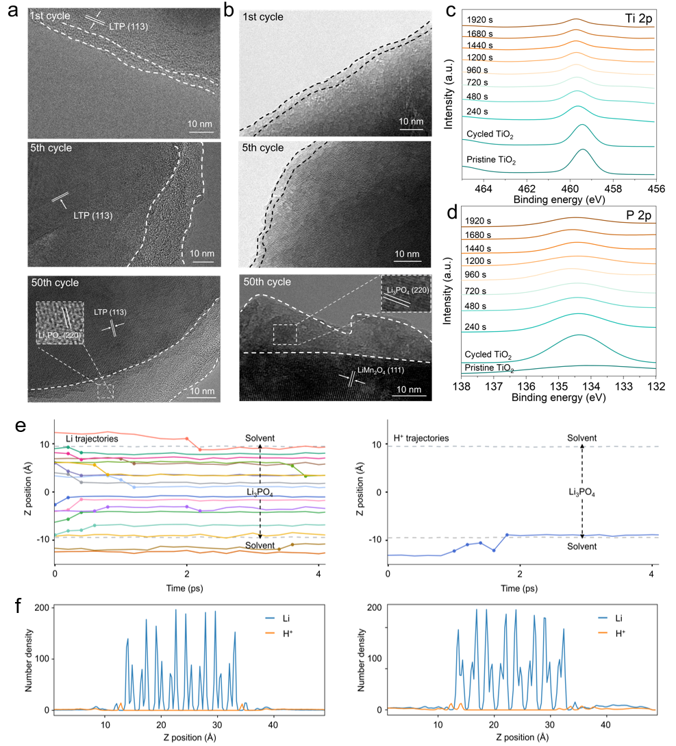 图1. 磷酸基界面层形成过程表征与MD模拟界面层中锂离子与氢离子传输轨迹