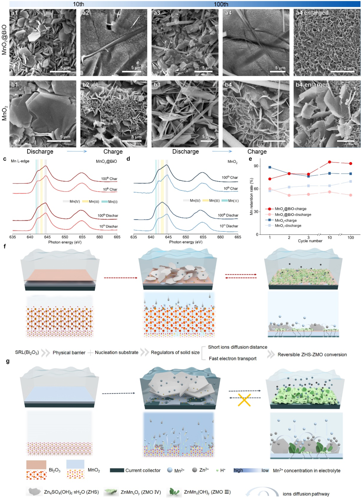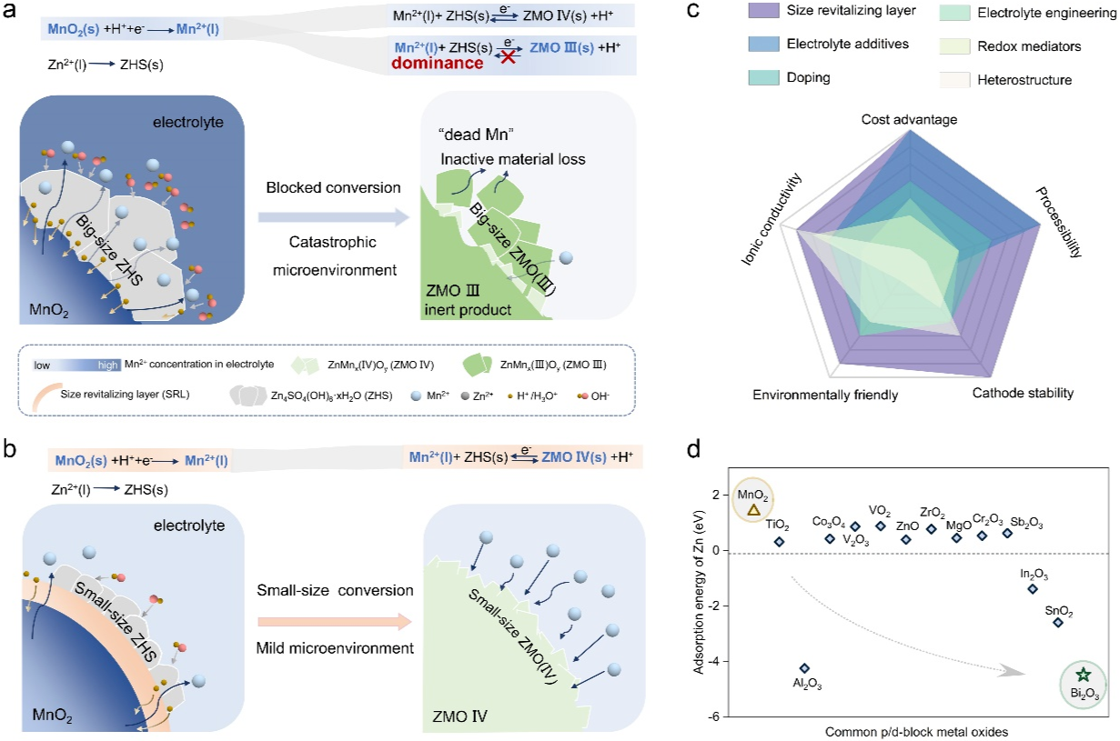 在电极界面调控方面,团队提出“尺寸恢复层(SRL)”策略,在MnO₂正极表面构筑纳米级Bi₂O₃超离子导体界面。该界面层能够通过持续释放Mn²⁺并协同锚定Zn²⁺,将传统固-固转换反应中产生的微米级反应产物转化为纳米级结构,从而显著改善离子扩散动力学并提高反应可逆性。基于该策略构建的复合电极在高面容量条件下实现超过1,000次稳定循环,在高负载铁板电池体系中亦表现出长期稳定运行能力。该成果以 “Revitalizing nanoscale solid-solid conversion enables ultrastable aqueous batteries”为题发表在期刊National Science Review上。中国科学院大学博士生孙志欣、上海硅酸盐所博士后韩梅、中国科学院大学博士生刘雨淳为此论文共同第一作者。上海硅酸盐所支键研究员、加拿大滑铁卢大学/宁波东方理工大学陈璞院士与中国科学技术大学周敏教授为共同通讯作者。