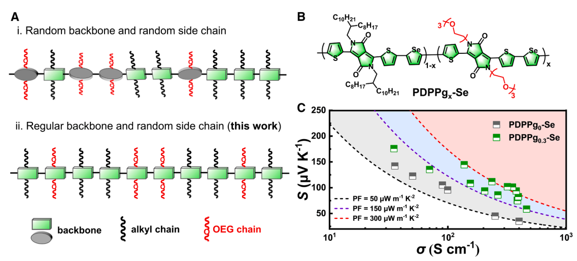 图1 (A) 主链规整而极性侧链随机分布聚合物设计策略;(B) 聚合物PDPPgx-Se的化学结构;(C) FeCl3掺杂的PDPPg0-Se与PDPPg0.3-Se薄膜的热电性能对比