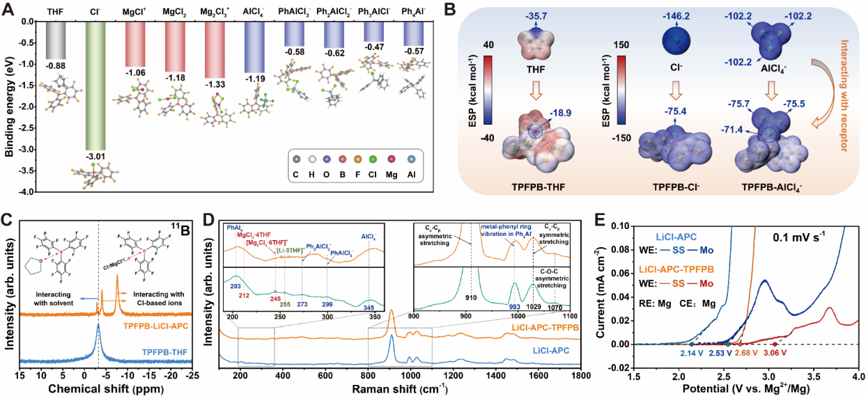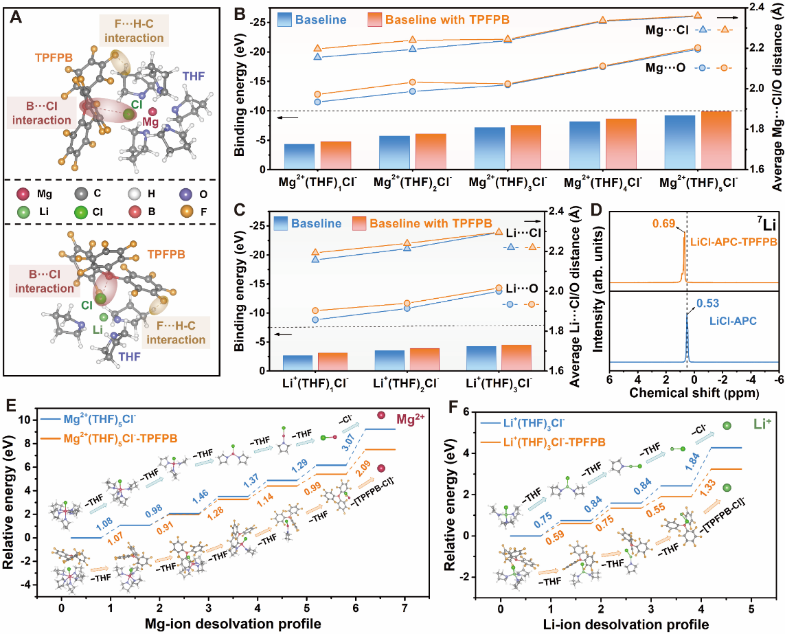 利用阴离子受体TPFPB实现APC类型电解液中Mg离子和Li离子的溶剂化调控
