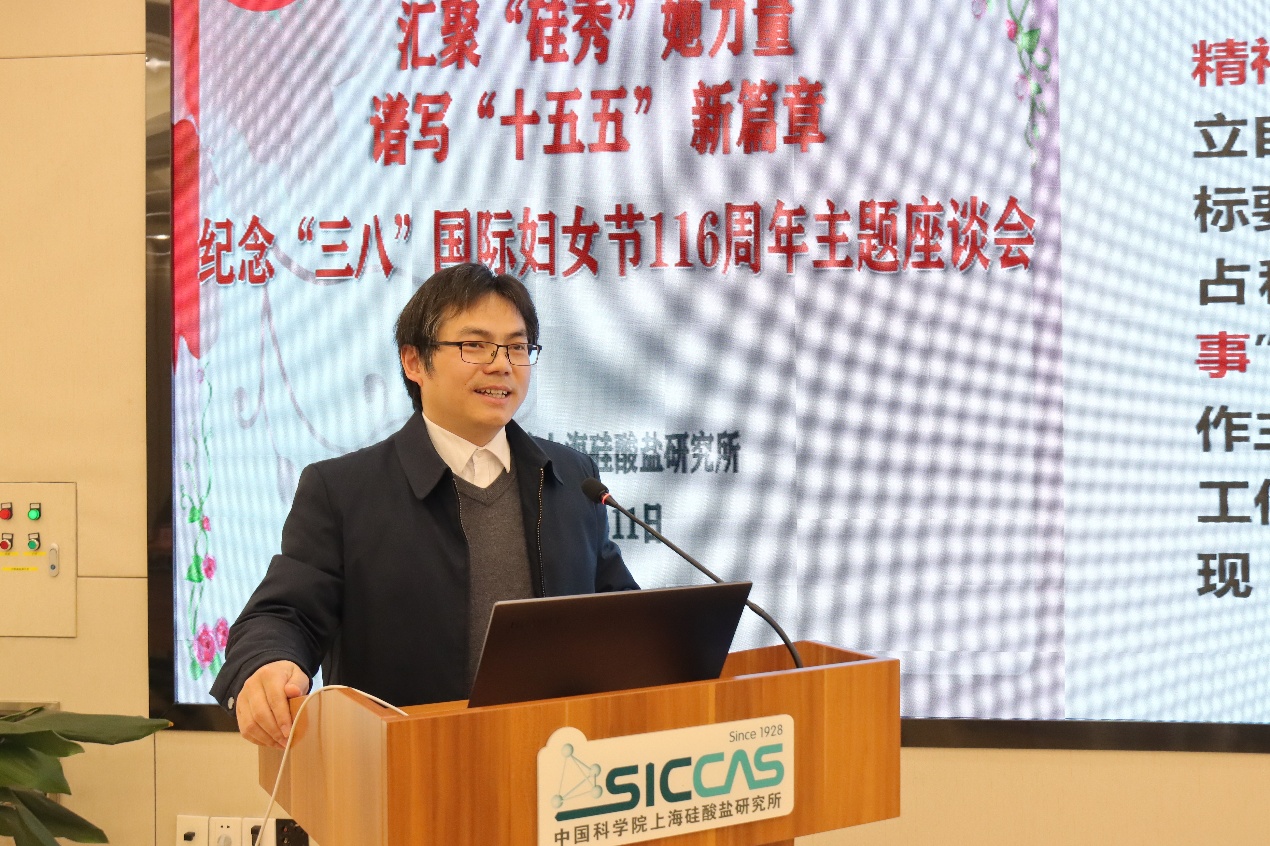 3月11日上午,中国科学院上海硅酸盐研究所妇女工作委员会召开纪念“三八”国际妇女节116周年主题座谈会。本次会议以“汇聚‘硅秀’她力量,谱写‘十五五’新篇章”为主题,深入学习贯彻中国科学院2026年度工作会议精神,表彰先进、分享经验、凝聚共识,进一步激发全所女性科技工作者的创新活力与奋斗热情。上海市科技妇工委主任何晌艳,全国妇联执委、中国科学院上海分院妇委主任、中国科学院上海药物研究所研究员柳红,嘉定区妇联主席姚芳,上海硅酸盐所纪委书记、党委委员周田华,党委委员、所务委员、党委办公室主任、所办公室主任毛朝梁,工会主席孙伟嬿,以及所妇委委员、女职工代表、女研究生代表等60余人出席会议。会议由妇委副主任袁兰英主持。