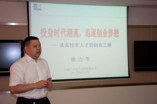 之后,姚力军博士以“投身时代潮流 追求创业梦想——谈高科技人才的创业之路”为题作了主题报告,结合其人生经历和创业历程,讲述和交流了对创业的体会、理解和感悟,他对创业梦想的坚持、实干报国的理想深深打动了在场的每一个人。姚力军,哈尔滨工业大学金属材料专业博士,1994年获日本文部省奖学金赴日留学,在广岛大学获得第二个博士学位。1997年加入世界500强的Honeywell公司,先后担任电子材料事业部研发工程师、研发总监、技术总监和日本生产基地总执行官,2003年出任Honeywell电子材料事业部大中华区总裁,2005年回国创立宁波江丰电子材料有限公司。机一党支部党员群众、科技发展部相关管理人员及有关研究领域课题组研究人员认真听取了报告,并与姚力军博士就人才联合培养、感兴趣的研究领域及产业化进程相关具体问题进行了深入探讨。