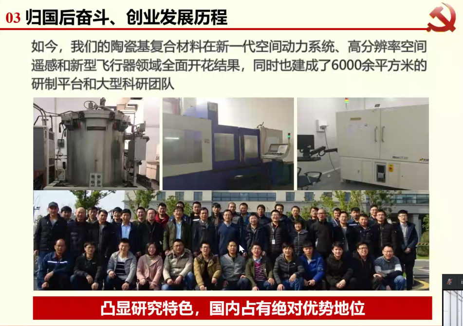 2002年回国后,董院士在研究所开展碳化硅光学部件的研制工作,但他依然坚守着“将陶瓷基复合材料植根于祖国的大地”的志向,通过挤占休息时间开展陶瓷基复合材料的研究。在第一件碳化硅光学部件研制成功并交付使用后,他毅然决然离开条件优渥的原课题组,全身心投入于陶瓷基复合材料研究方向,只为实现自己的梦想,报效国家。