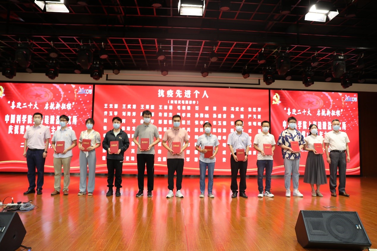 在“同心战疫”篇章,参会人员观看了抗疫宣传片,回顾了自今年3月疫情防控以来,上海硅酸盐所党员、群众高举科研战线抗疫大旗,一手抓疫情防控,一手抓科研生产,以实际行动诠释了全体硅所人身为“国家队”“国家人”,心系“国家事”、肩扛“国家责”的使命与担当。在疫情防控过程中,涌现出了一批先进集体与个人,为保障园区安全、重大科研生产任务顺利开展付出了巨大努力。宋力昕为获得“上海分院抗疫先进集体”的团队代表——联合防疫保障临时党支部、热控涂层课题组颁奖;周国丞为获得“上海分院抗疫优秀个人”的同志——何平、石超、赵仁盛、顾青华、徐真颁奖;副所长沈兆雷宣读了所抗疫先进集体与个人表彰决定,并为13个抗疫先进集体颁奖;副所长吴成铁、苏良碧为20位抗疫先进个人代表颁奖。