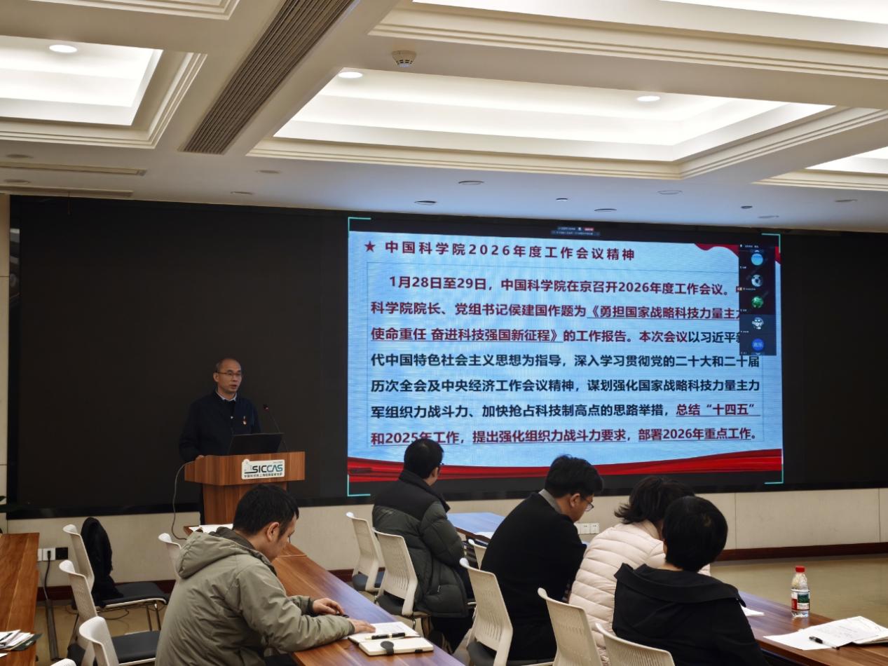 为深入学习贯彻中国科学院2026年度工作会议精神,进一步统一思想、凝聚共识,中国科学院上海硅酸盐研究所结构陶瓷与复合材料工程研究中心党支部于3月26日下午召开“凝心铸魂强根基 担当作为促科研”主题党日暨党组织组织生活会。上海硅酸盐所副所长、党委委员杨金山,党委办公室工作人员及支部党员、群众参加活动。会议由支部副书记何平主持。