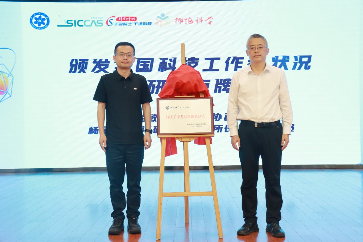 在上海市科协、嘉定区科协指导下,上海硅酸盐所获评由中国科学技术协会授予的全国“科技工作者状况调查站点”,林冬敏、杨金山共同为站点揭牌。