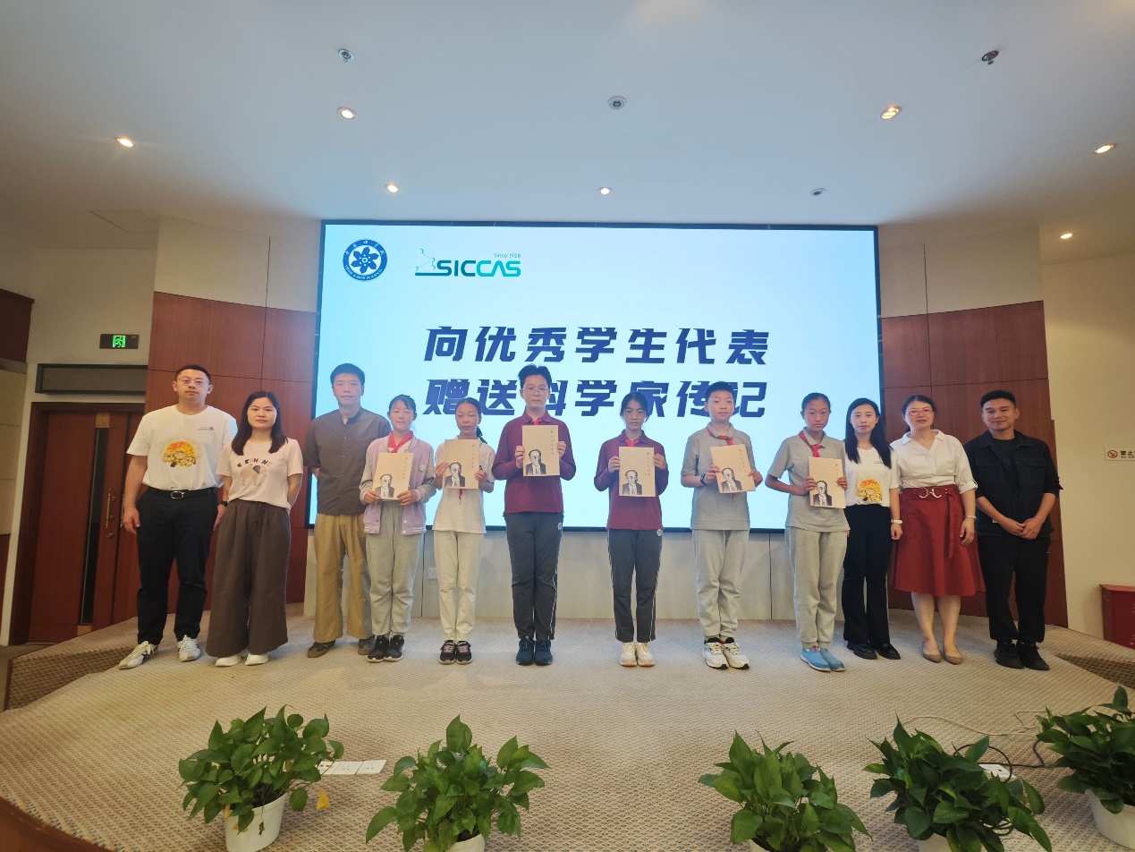 在长宁园区活动现场,段秀文、褚晶、姜立西、张宏、林翰、马红石为参加活动的6位优秀学生代表赠送上海硅酸盐所创始所长周仁先生纪念文集。