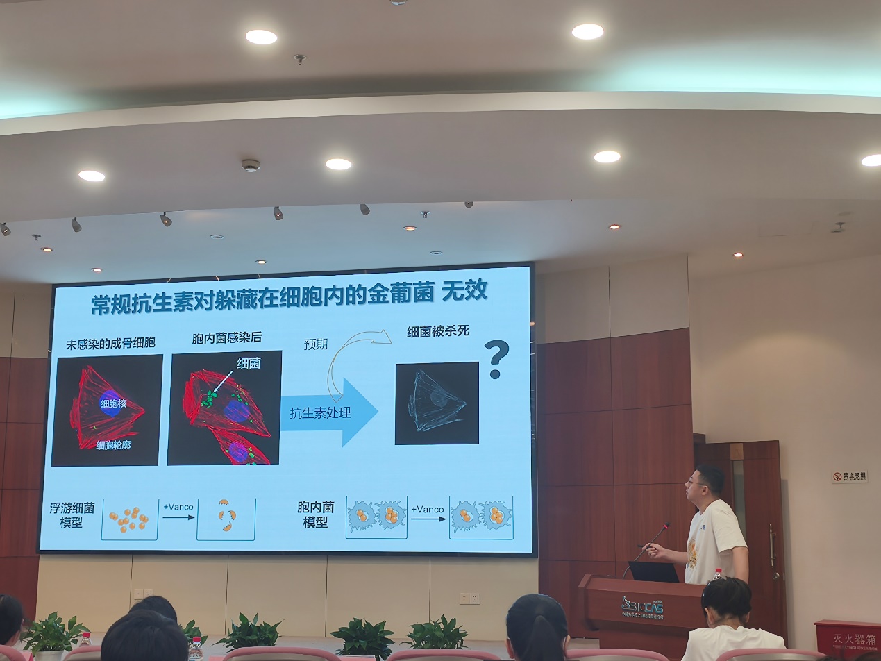林翰作了题为《基于功能仿生的纳米催化杀菌》的科普报告,报告介绍了一种杀伤藏匿在体内细胞中的细菌的新方法,利用人体内被感染体细胞与健康细胞的膜表面化学差异,模拟人体固有免疫细胞-自然杀伤细胞的功能,对危害人类健康的耐药胞内菌进行精确杀伤,为当下严峻微生物耐药问题提供解决方案。
