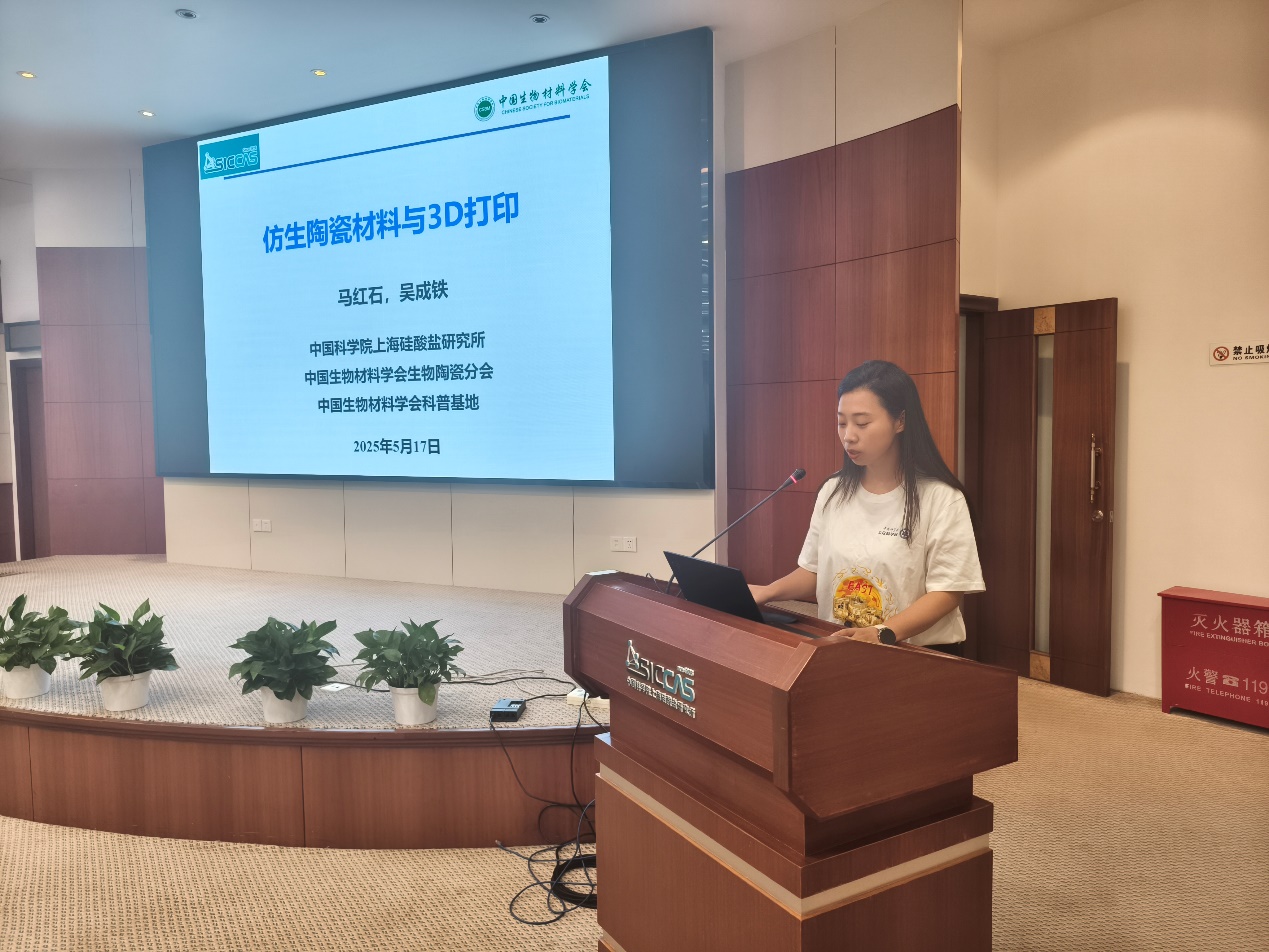 马红石作题为《仿生陶瓷材料与3D打印》的科普报告。报告从人体组织和器官大面积缺损后,无法自行再生修复的现实案例讲起,引出目前临床上常见的人工关节、人工种植牙等生物医用材料。报告介绍了3D打印技术的发展和原理,重点介绍了其所在课题组基于3D打印技术,开发的一系列具有主动促进骨组织再生功能的仿生生物活性陶瓷支架。报告表示,3D打印技术构建生物材料在现代医学领域有重要价值,有望为解决人体组织缺损修复和器官再造提供有效的手段,推动医学事业持续进步。