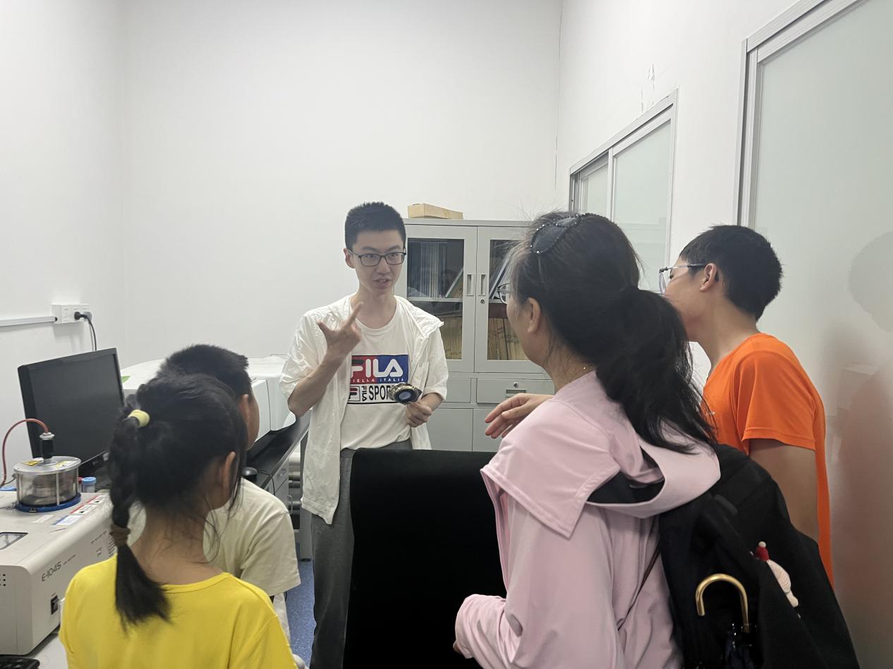在实验室参观环节,孩子们走进中国生物材料学会科普基地以及生物材料表面与界面课题组实验室。志愿者汤凯、金柯男、郑博文介绍了基地和实验室的研究领域、科研进展、应用场景等,并与孩子们进行了互动交流。