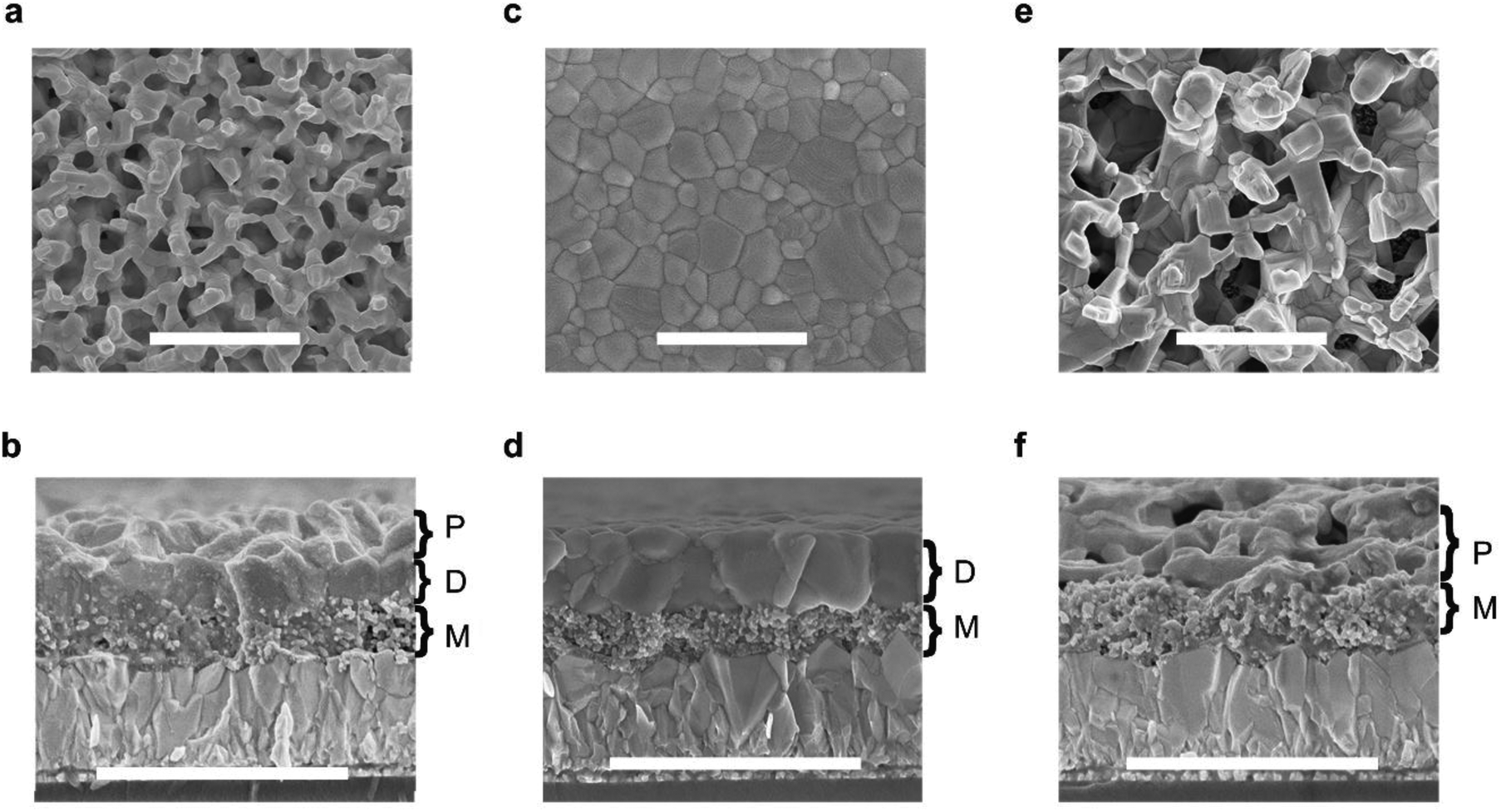 设计制备了一种孔径在较大范围(15-34nm)可调的TiO2介孔层,通过孔径尺寸的调节,获得孔径达34.2nm、孔隙率达73.5%的TiO2介孔层,从而顺利实现了钙钛矿晶粒在介孔层中的完全填充,获得了效率高达15.47%的无滞后钙钛矿太阳能电池,并阐明了滞后消除机理,对稳定可重复的钙钛矿太阳能电池的制备具有重要意义。该团队分别对比了一步溶液法和两步气相辅助溶液法对钙钛矿晶粒在TiO2介孔层中渗透与填充的影响规律,发现孔径是影响钙钛矿晶粒填充的关键,通过两步气相辅助溶液法较容易得到无滞后的钙钛矿太阳能电池,而通过调节TiO2介孔层的孔径与厚度,实现钙钛矿晶粒在TiO2介孔层中的有效填充,也可以得到无滞后的钙钛矿太阳能电池。该团队通过研究发现,滞后的消除机理是通过钙钛矿晶粒与TiO2纳米晶的紧密结合,从而抑制钙钛矿薄膜中的离子迁移。