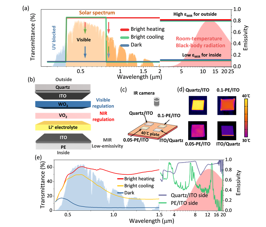 基于超材料理念的宽波段电致变色设计:从优化全波段(可见光、近红外、中远红外)光热交换的角度出发,构建“多频段解耦辐射界面”(高/低辐射界面),开发新型电致变色结构,优化窗户辐射热交换,突破传统电致变色材料的光谱调控局限(Nature Sustainability 7, 796-803 2024)。