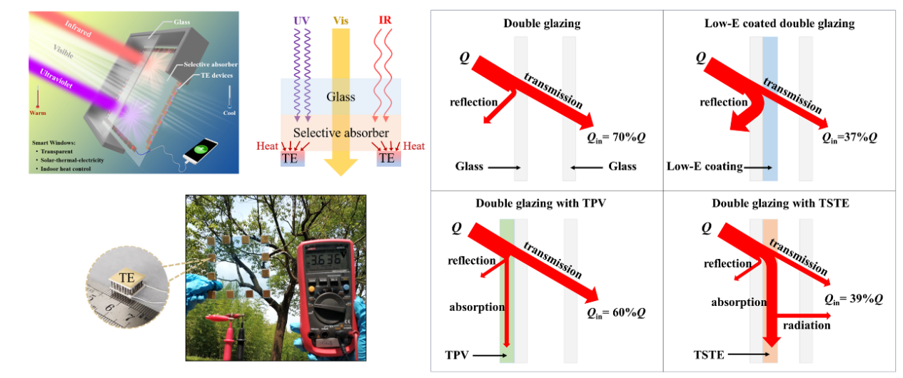 实现碳中和与确保能源可持续利用的紧迫目标,推动着人们对太阳能利用技术提出创新且经济可行的新要求。光热发电(PTE)转换是一种高效的太阳能采集与电能转化策略。该技术融合了光热效应与热电效应,其原理在于:系统吸收太阳辐射产生温差,并基于塞贝克效应将温差转化为电压。波长选择性吸收膜的设计可使可见光透过,同时尽可能吸收紫外光和近红外光并将其转化为热能。由此持续收集的热能会通过薄膜横向传导至热电装置的热端。这种发电系统使能量转换效率与窗户透光性实现解耦,从而可对二者分别进行独立调控。
