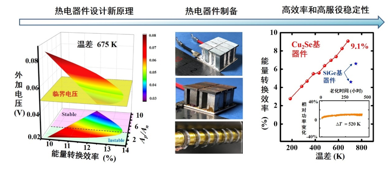 3. 提出新型热电材料器件设计新原理和新方法,获得了兼具高能量转换效率(9.1%)和高服役稳定性的新型热电器件