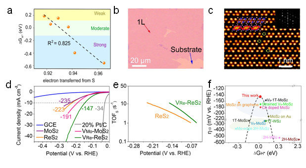 单层具有金属空位的二硫化铼用于HER催化 (a)电荷补偿机制;(b)大面积连续单层ReS2;(c) ReS2面内Re空位;(d) LSV曲线;(e) TOF值;(f) HER催化性能比较