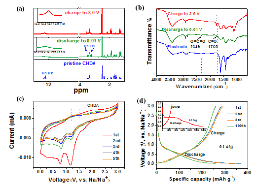 (a-b)原始CHDA、放电到0.01V和充电到3.0V三种状态下的1H核磁共振与红外光谱表征氢转移机制;(c-d)电化学测试, CV曲线(0.5 mV/s),充放电曲线(0.1A/g)