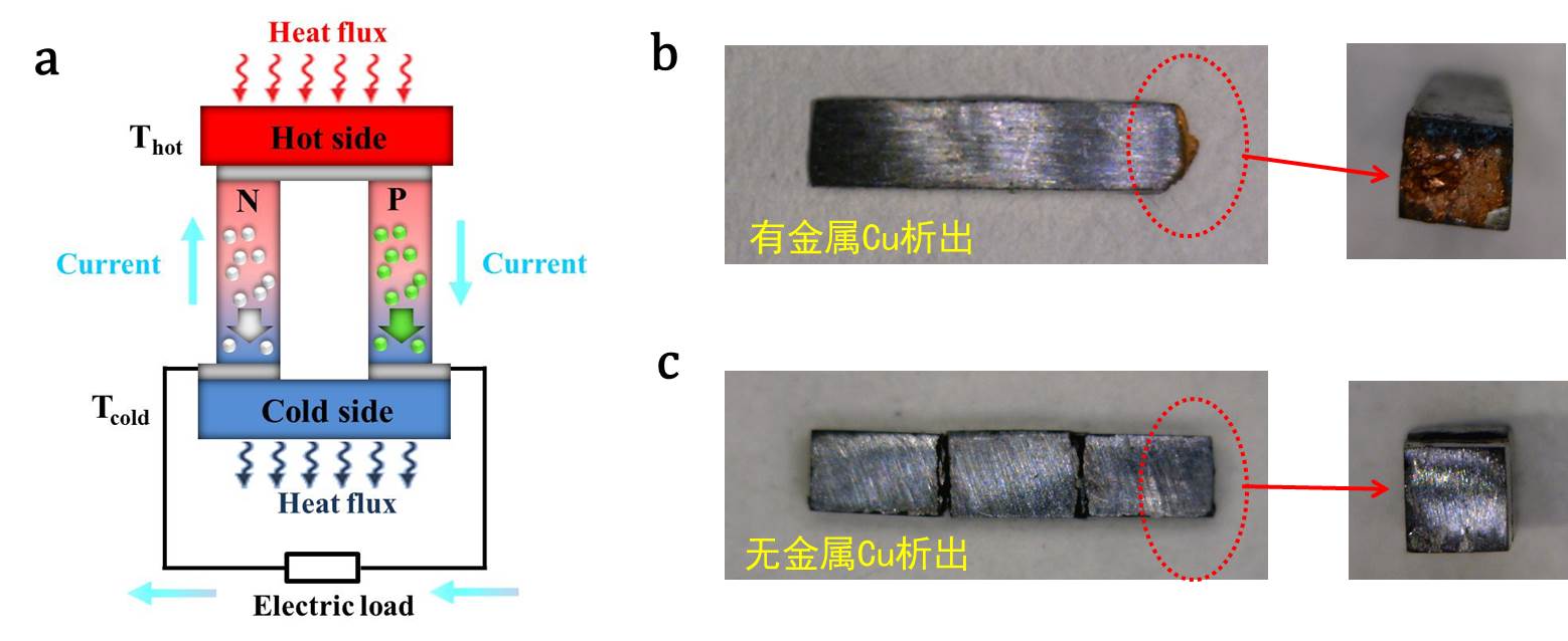 (a) 类液态热电材料的工作环境;大电流作用下(b)普通类液态热电材料和(c)具有“离子阻挡-电子导通”界面的类液态热电材料端面金属Cu析出情况