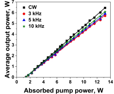 研究团队采用1.94微米Tm光纤激光器做泵浦源,在0.5 at.% Ho:CaF2晶体中获得了斜效率59.8%、功率7.17 W的2μm波段连续激光输出。并且,利用声光调Q技术,实现了脉宽54 ns、单脉冲能量1.9mJ、重复频率3kHz的脉冲激光输出,平均输出功率5.71W,斜效率为48.5%。