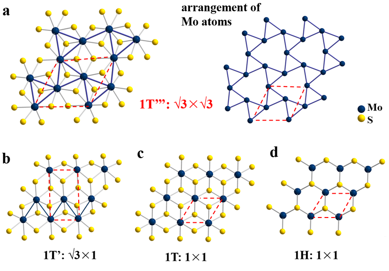 (a)(b)(c)(d)分别为1T’’’, 1T’, 1T, 1H二硫化钼的结构示意图