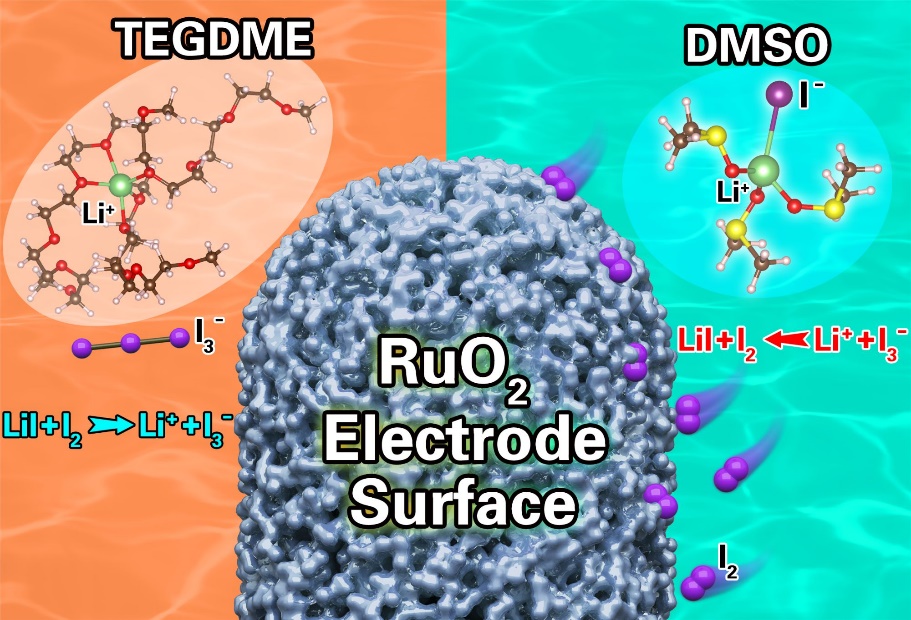利用这一新发现的化学现象,研究团队进一步组装了锂氧气电池,采用RuO2纳米颗粒做正极,基于TEGDME电解液的电池,在前10圈的循环过程中,充电过电位在逐步上升,而基于DMSO电解液的电池,充电过电位在逐步下降。证明了在DMSO电解液中,RuO2可以有效地将I2锚定在RuO2正极上,不但提高了催化效率,而且抑制了I2在电解液中扩散,避免了其与锂金属接触发生副反应,从而有效提高了电池的循环稳定性。