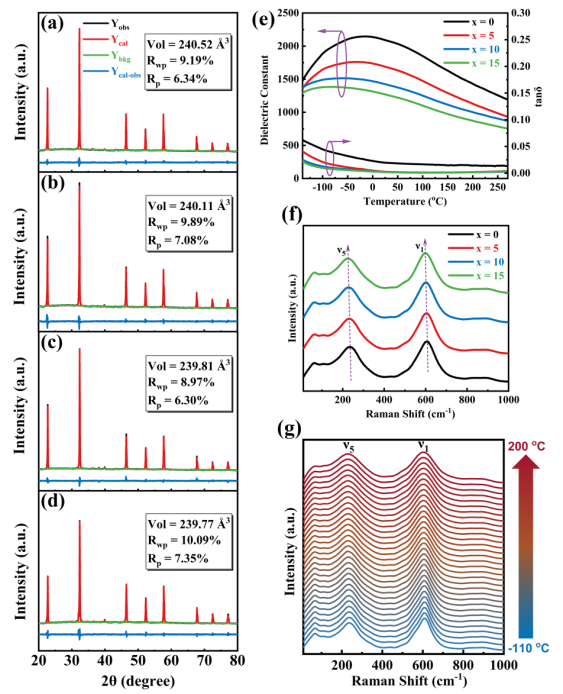 NBNTx陶瓷的(a-d) XRD结构精修、(e)介电温谱、(f) 拉曼光谱,(g) NBNT10陶瓷的变温拉曼光谱