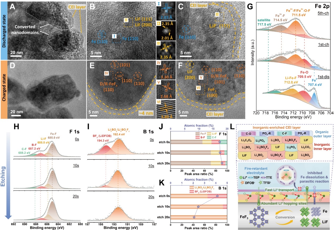 氟化铁正极在阻燃电解液中循环后的物相结构与界面膜形貌组分
