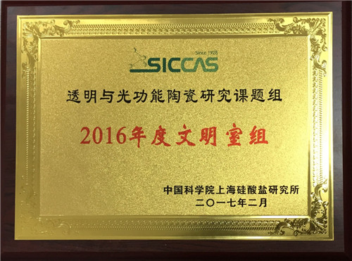 透明与光功能陶瓷研究课题组荣获2016年度中国科学院上海硅酸盐研究所文明室组