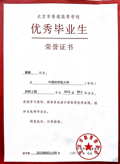硕士研究生葛琳获2014-2015学年中国科学院大学“优秀毕业生”荣誉称号