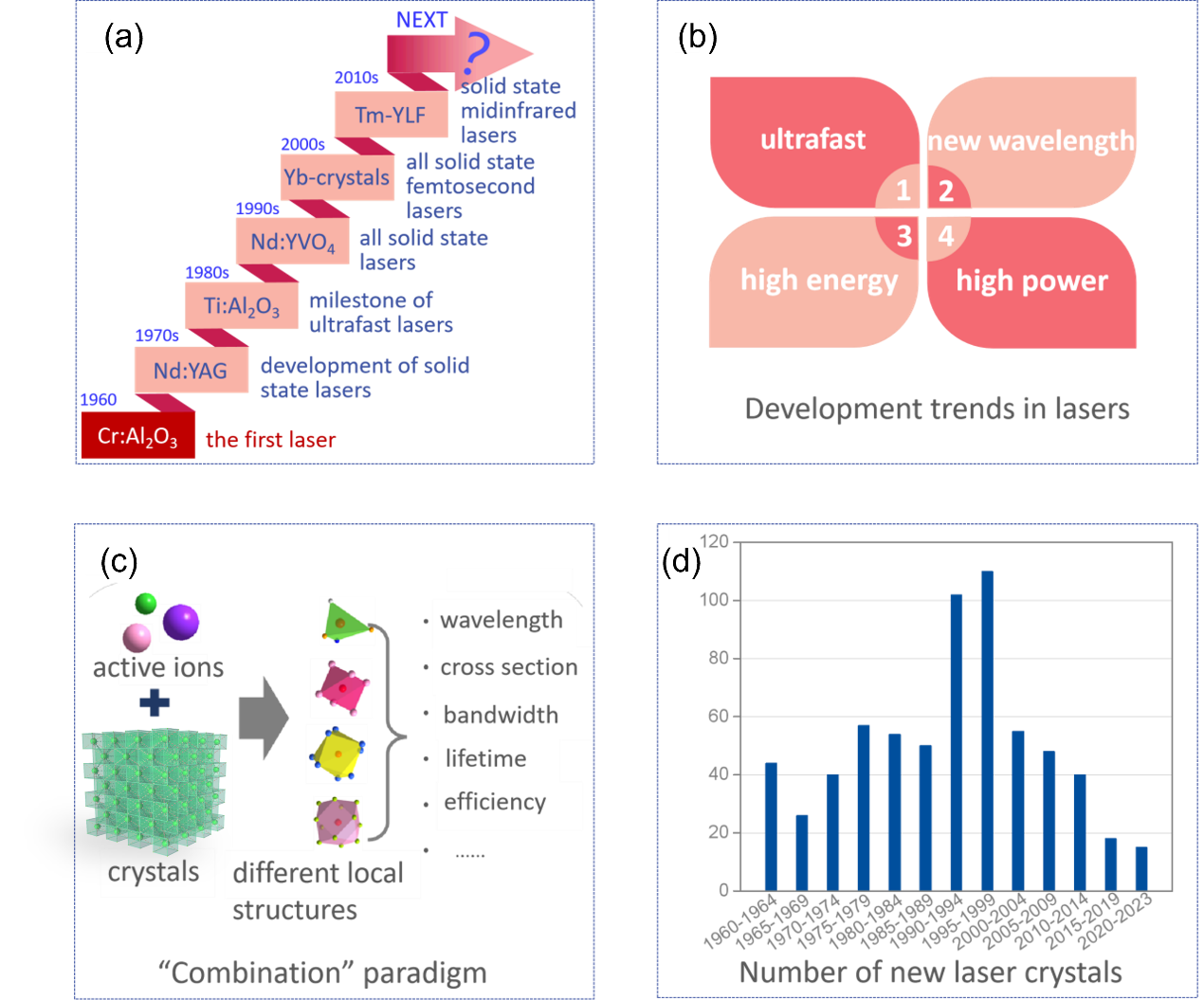 图1 激光技术与激光晶体的发展历程:(a)激光晶体的创制持续推动前沿激光技术发展;(b)激光技术发展的四大方向:超短脉冲、新波段、大能量和高功率;(c)传统激活离子与基质晶体“交叉组合”的发展范式;(d)基于“交叉组合”范式创制激光晶体的总量有限,新晶体创制进入瓶颈期。