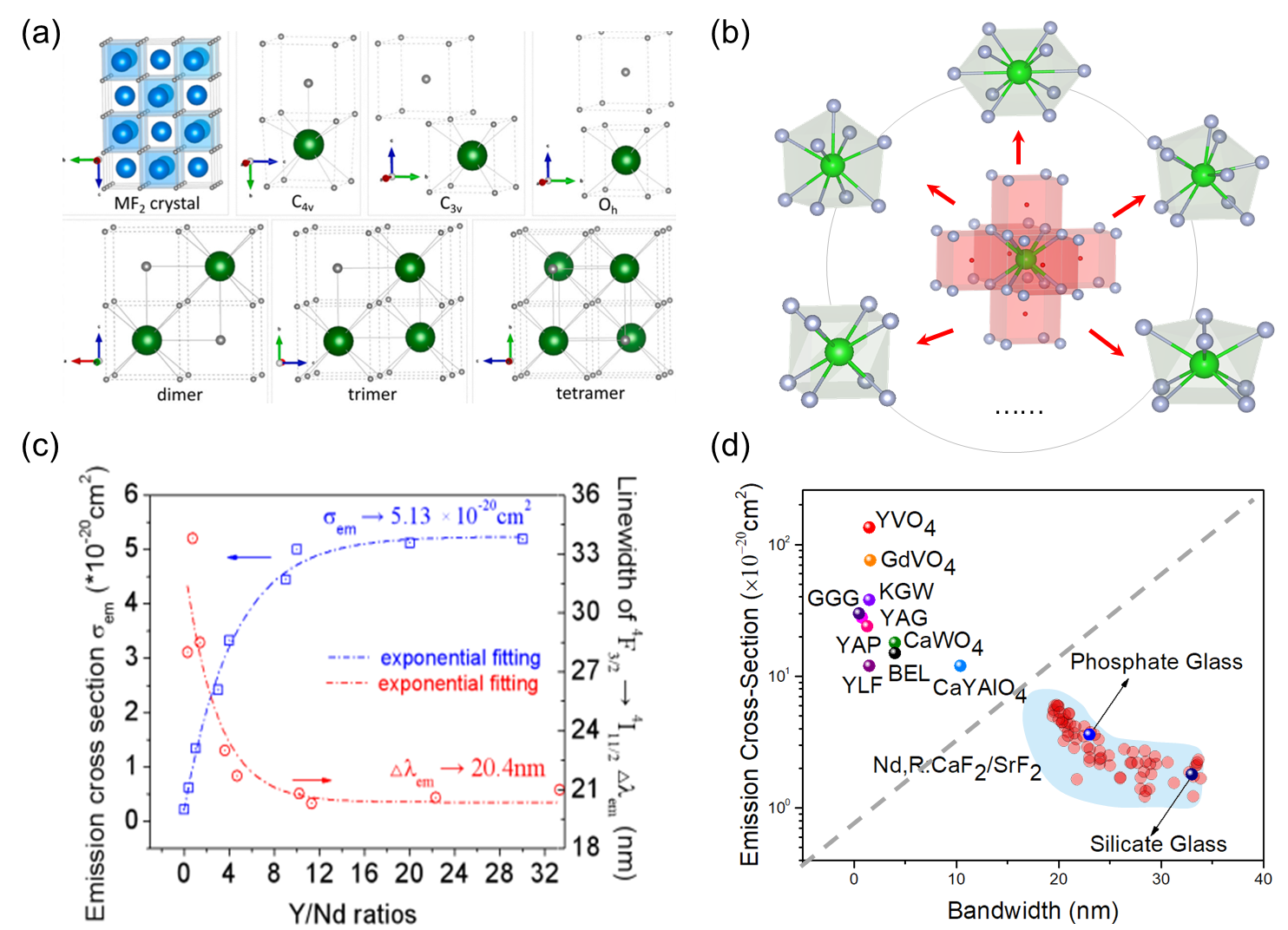 图2稀土离子局域结构重构策略实现激光晶体光谱性能大范围调控:(a)在碱土氟化物晶体中构建不同维度、不同尺度的离子团簇结构;(b)开放型立方结构晶体作为结构研究平台可实现稀土离子局域格位结构的灵活操控;(c)共掺结构调剂离子实现晶体光谱参数大范围调控;(d)“有序-无序耦合”结构赋予掺Nd晶体超越传统激光材料性能边界的光谱性能。