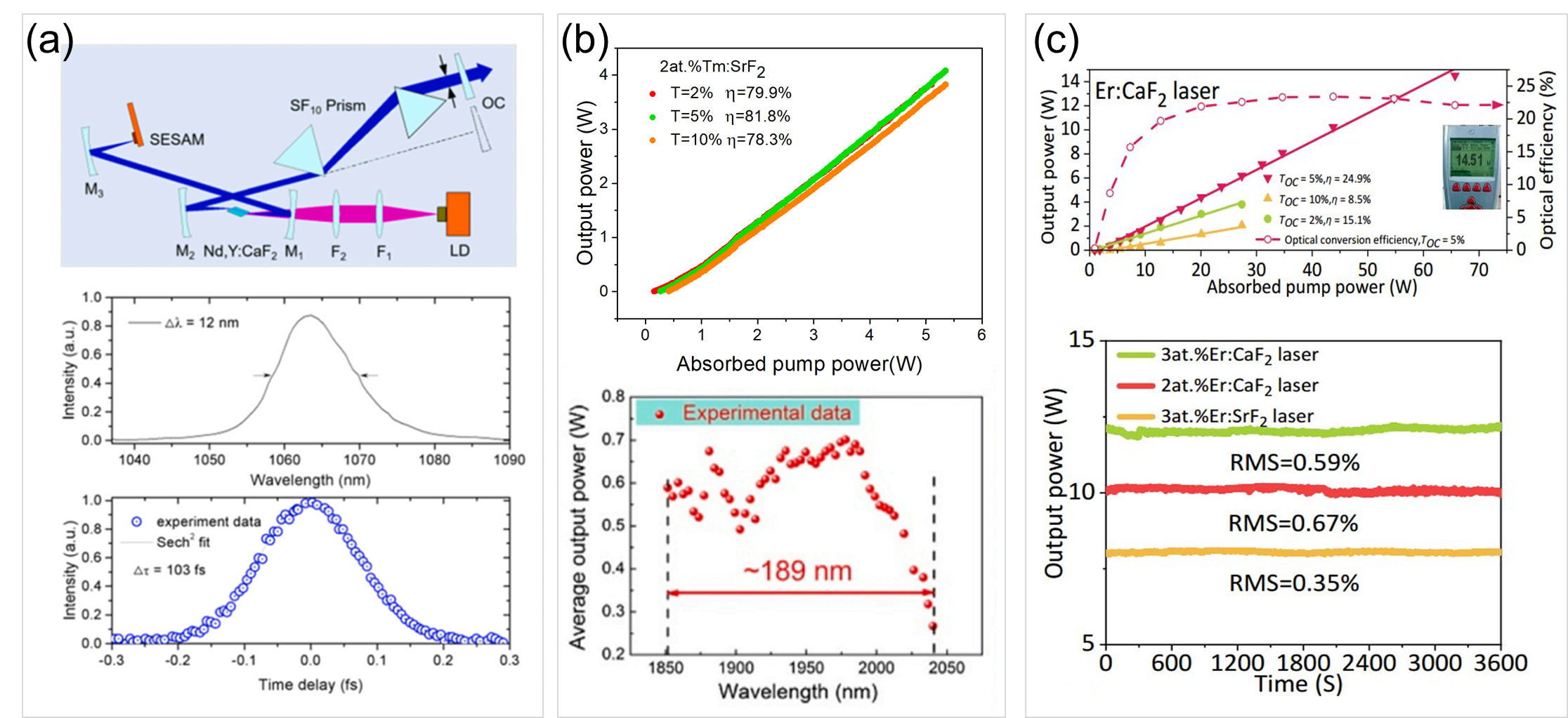 图3研制的新序态激光晶体在超强超快激光、中红外激光等领域取得一系列新突破:(a)NYCF晶体国际上率先将掺Nd晶体超快激光脉冲宽度推进至百飞秒;(b)TmSF晶体81.8%斜效率刷新了Tm激光效率世界记录;(c)ErCF晶体实现了最大功率15 W的3μm波段连续激光输出。