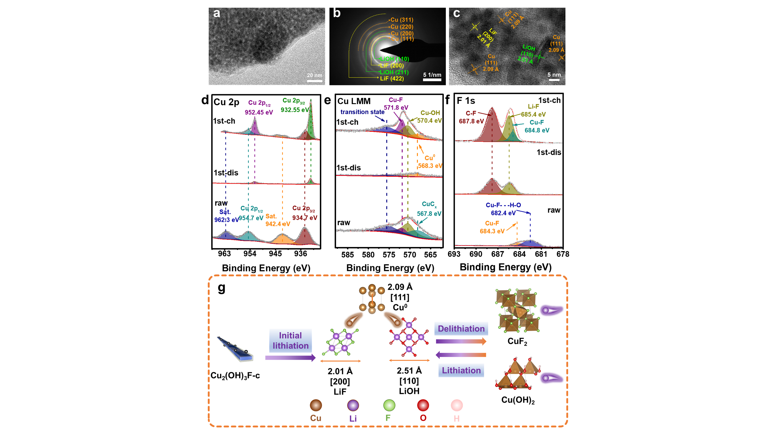 该工作首先通过碱性环境中的溶剂热合成制备出Cu2(OH)3F和碳的复合正极材料(Cu2(OH)3F-c),合成中原位掺杂的导电碳被碎片成薄层碳,保形包覆在微米级板条状的一次颗粒上,这些颗粒自组装成类海胆状形貌的多孔聚集体,实现微米尺度的长程电子传输和电解液的高效浸润。通过对Cu2(OH)3F-c和m-CuF2的微分电容行为分析,发现在充电过程中,铜溶解行为出现越早,活性物质损失越多,电化学可逆性和循环寿命越差。利用对循环后电解液的新亚铜试剂检测法,发现溶解的Cu主要为Cu+,Cu2(OH)3F-c中大量OH的存在抑制了Cu+的溶解及其相关副反应,且OH的存在也提高了Cu-anion晶域的电子导电性,改善了氟化物的反应动力学。此外,OH的存在使Cu2(OH)3F-c产生了分相转换的反应机制,该机制极大增加了多相异质界面,通过空间位阻效应阻止了Cu离子的扩散和溶解,抑制了Cu金属域的生长或粗化,从而提高了反应可逆性。同时,多相界面的丰富也增强了Li+沿晶界和异质界面的传输能力,提高了反应动力学。