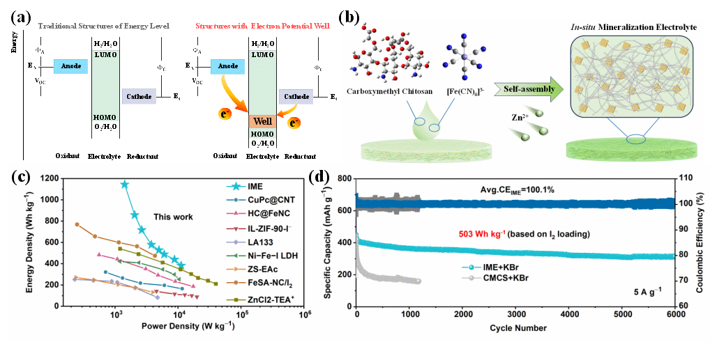 原位矿化电解质中电子势阱介导机制示意图(a-b)及高比能水系锌基电池电化学性能(c-d)