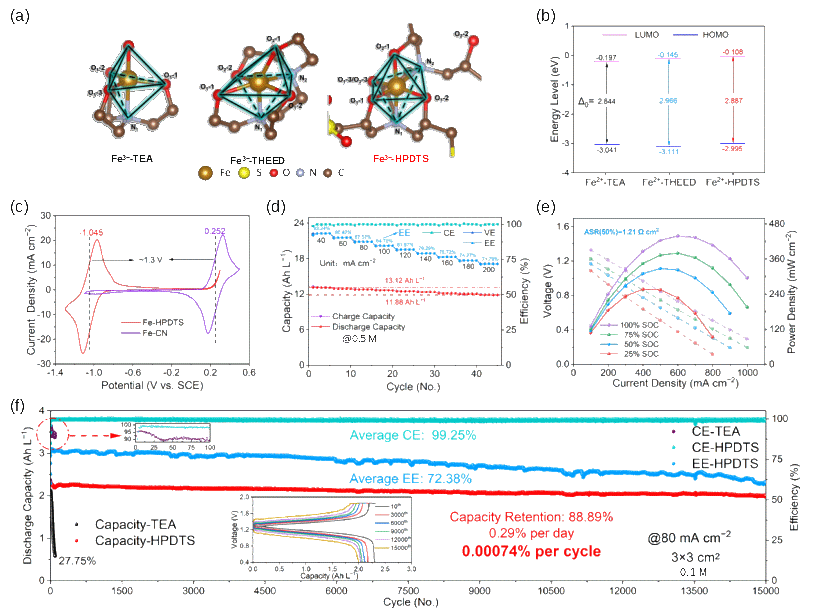 分子定制设计的铁基螯合物电极材料助力长寿命高效率水系铁基液流电池:针对传统铁螯合物如Fe-TEA、Fe-THEED等负极结构不稳定,易发生配体穿梭与分解的问题,团队通过精细的分子裁剪,设计出一种新型配体2-羟基-1,3-丙二胺四磺酸钠盐(2-hydroxy-1,3-propanediamine tetra-sulfonate sodium salt,HPDTS),实现了配体结构与螯合构型的双重调控,构建出高稳定性和可逆性的对称六配位铁螯合物负极。该设计不仅保留了传统五配位负极材料较低的氧化还原电位,而且HPDTS与铁形成的对称六配位结构具有更短的Fe-O键长和更高的LUMO能级,从根本上增强了络合物的稳定性,解决了负极螯合物易分解产生铁枝晶和析氢的痛点问题。采用Fe-HPDTS螯合物负极材料与商用铁氰化物正极可以组成1.3 V稳定的水系铁基液流全电池。此外,得益于该负极材料更大的体积和更高的负电荷数,其拥有优异的配体选择性,搭配廉价的高离子电导率的非氟质子交换膜PBI时,全电池表现出卓越的性能,在200 mA cm−2下能量效率达71.79%,功率密度446.9 mW cm−2;并且循环寿命突破15,000次,容量衰减率仅为0.00074%/圈,平均库仑效率接近100%。这项研究不仅开发了一种高性能铁络合剂,更提出了“配体结构-螯合构型”协同设计的分子工程新范式,为铁基液流电池的实际应用奠定了坚实基础,该技术有望在电网级储能、可再生能源并网等领域发挥重要作用,推动长时储能技术的发展。