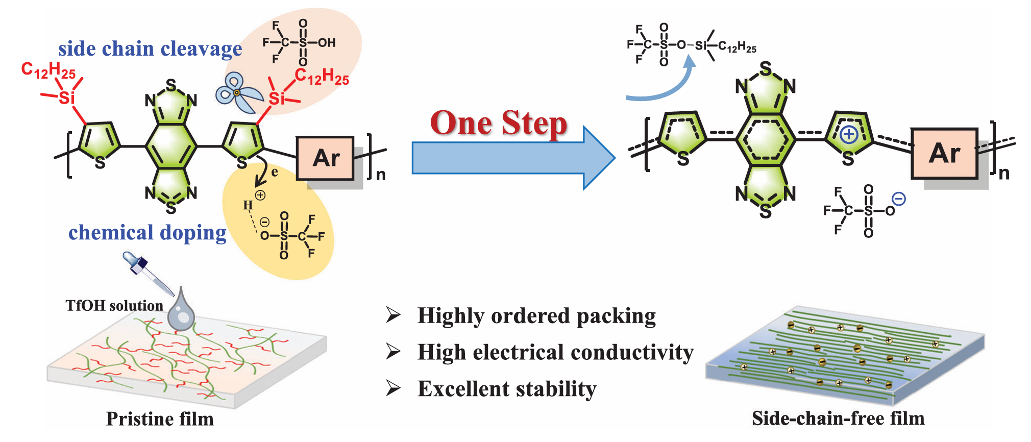 图2 苯并双噻二唑聚合物一步完成侧链裂解与高效掺杂