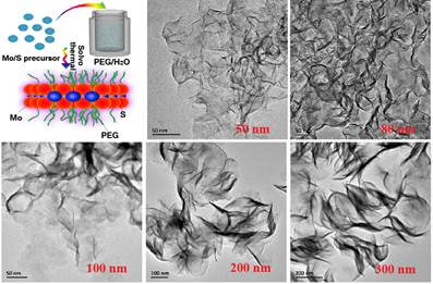 图1. MoS2纳米片的溶剂热合成示意及不同片径MoS2-PEG纳米片的TEM图