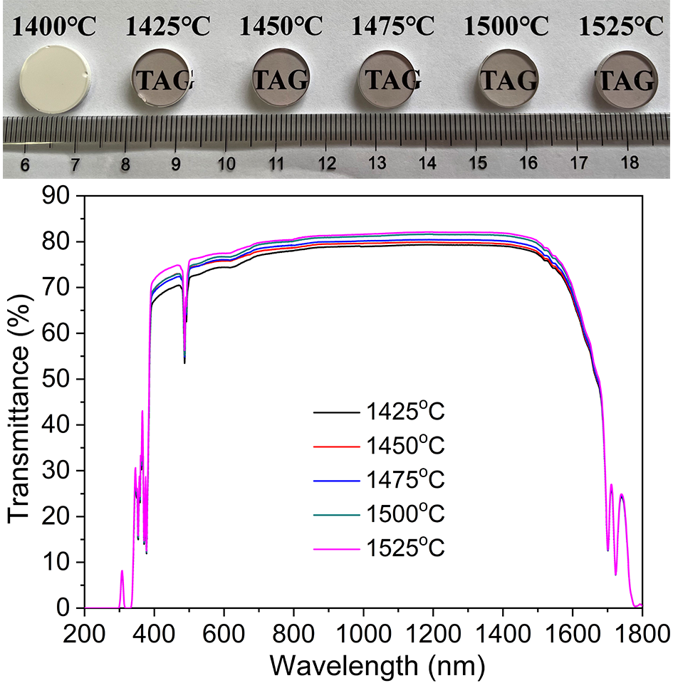 不同温度真空预烧结合HIP后处理(1600oC×3h)制备的TAG陶瓷的实物照片与直线透过率曲线
