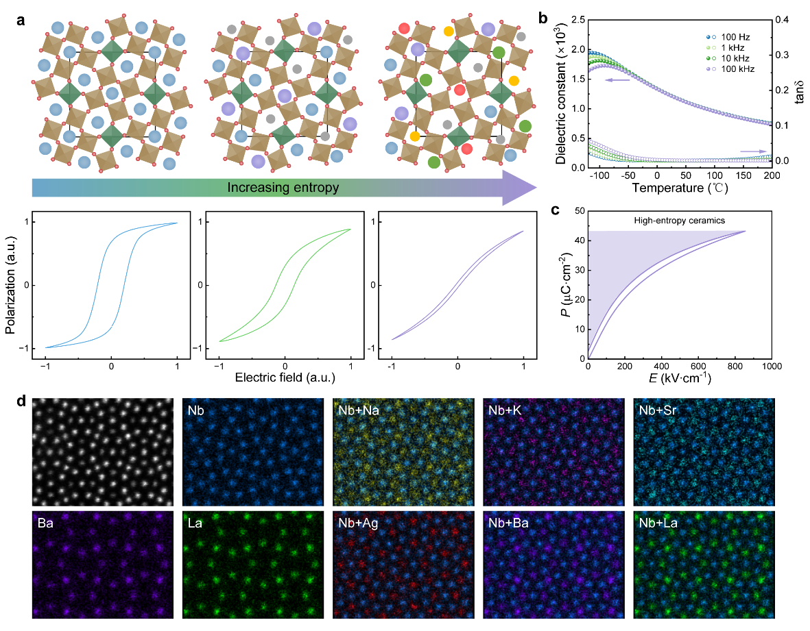 1. (a)基于TTB结构的多位点高熵设计,(b-c)TTB高熵陶瓷的介电和储能性能,(d) TTB高熵陶瓷的原子级EDS