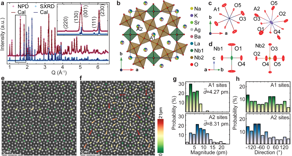 2. (a-d) TTB高熵陶瓷的结构精修, (e-h) TTB高熵陶瓷的晶格结构畸变