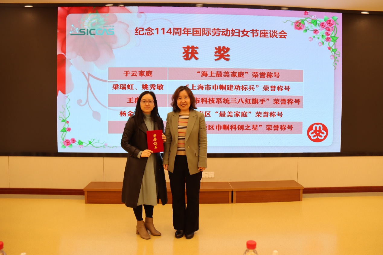 2023年在所党委的领导、关怀与支持下,所妇委荣获多项荣誉,涌现出一批先进典型,会上对先进集体及个人进行表彰。梁瑞虹研究员、姚秀敏研究员获“上海市巾帼建功标兵”荣誉称号;王冉冉研究员获“上海市科技系统三八红旗手”荣誉称号;谷红宇副研究员获“菊园新区巾帼科创之星”荣誉称号。于云研究员家庭获“海上最美家庭”荣誉称号;杨金山研究员家庭获“嘉定区‘最美家庭’”的荣誉称号。各位颁奖嘉宾向勤勉工作、无私奉献的优秀女同胞们表示感谢,感谢她们在研究所发展和抢占科技制高点任务中发挥的重要作用。