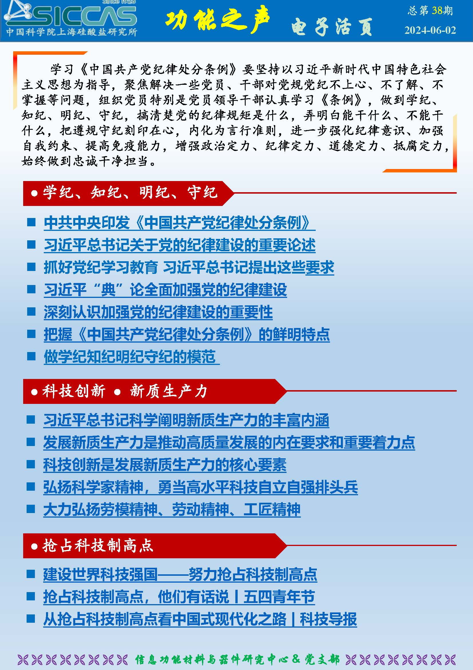 在《功能之声》发布篇中,支部推出了支部电子活页《功能之声》第38期“党纪篇”专刊、第39期“基础研究篇”专刊,为中心广大科研人员学习《条例》以及中心不同课题组应届毕业研究生亮点成果的相互交流创造了条件,受到了大家的热烈欢迎和高度点赞。