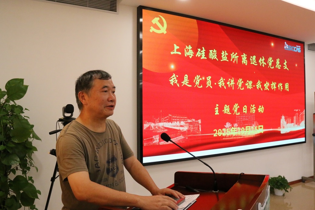 10月15日上午,中国科学院上海硅酸盐研究所离退休党总支举行“我是党员•我讲党课•我发挥作用”主题党日活动,35位离退休党员参加了此次活动。活动由所离退休党总支书记孙伟嬿主持。