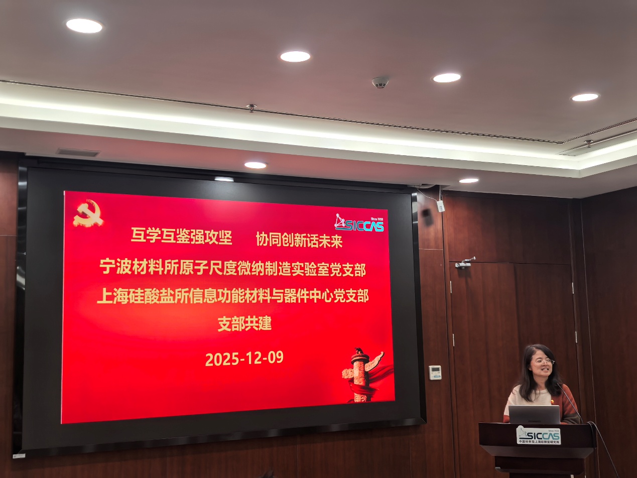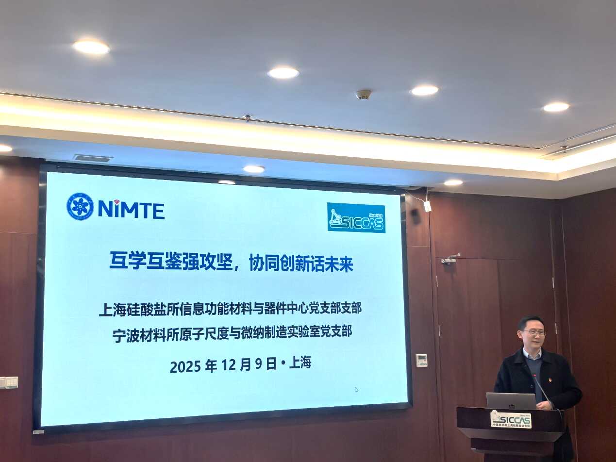 为深入学习贯彻党的二十届四中全会精神,12月9日下午,中国科学院上海硅酸盐研究所信息功能材料与器件研究中心党支部与中国科学院宁波材料技术与工程研究所原子尺度微纳制造实验室党支部联合开展“互学互鉴强攻坚,协同创新话未来”主题党日活动。上海硅酸盐所党委委员、所务委员、党委办公室主任、所办公室主任毛朝梁,宁波材料所原子尺度微纳制造实验室党支部书记曹彦伟,上海硅酸盐所纪委委员、信息功能中心主任王根水,信息功能中心党支部书记、副主任曾华荣及双方党员和科研人员等参加了共建活动。活动由信息功能中心党支部副书记梁瑞虹主持。
