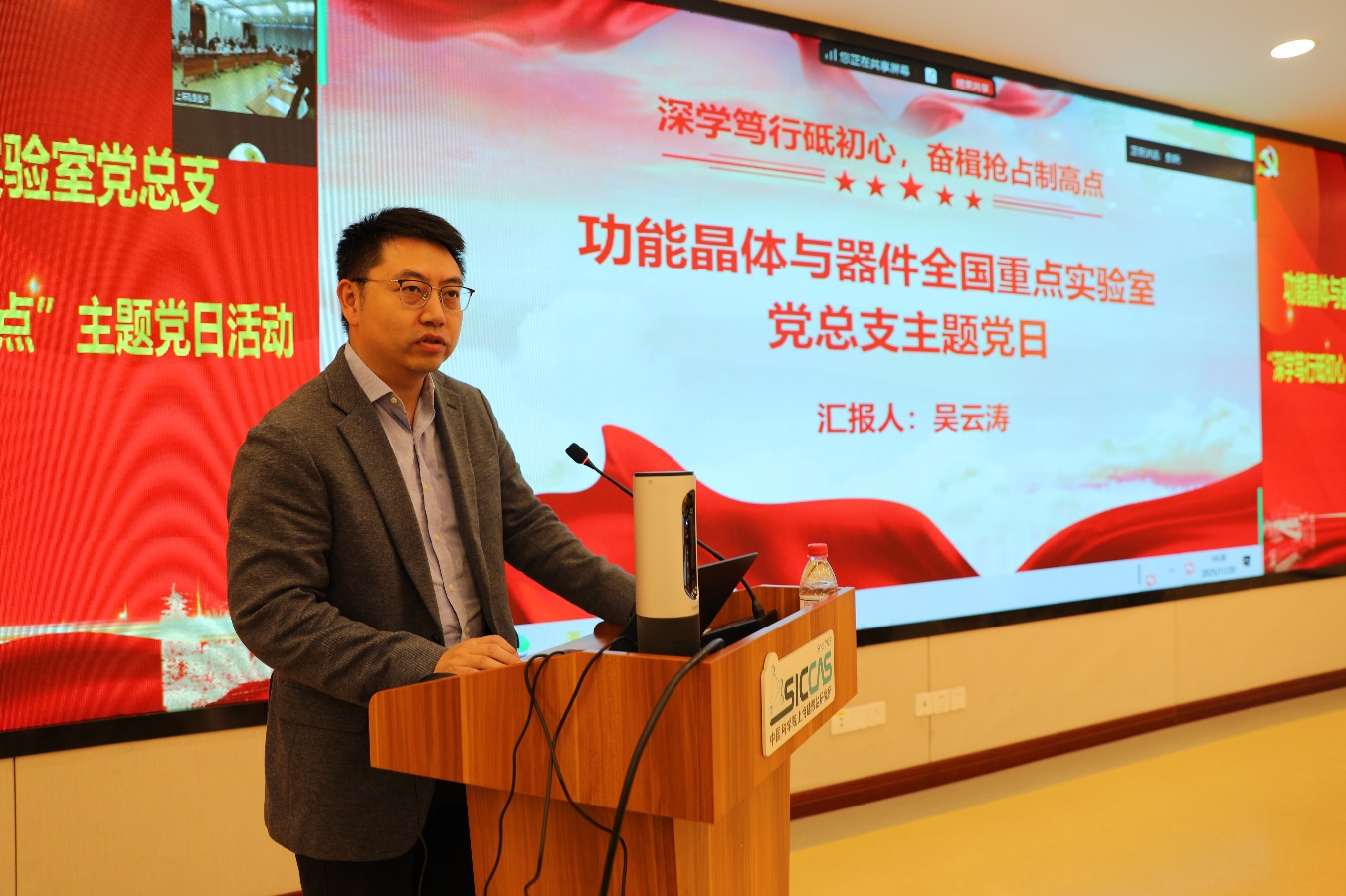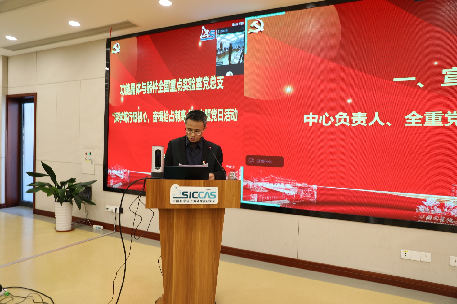为全面推进实验室高质量建设,11月20日下午,功能晶体与器件全国重点实验室上海硅酸盐所党总支(以下简称“晶体全重党总支”)组织开展“深学笃行砥初心,奋楫抢占制高点”主题党日活动暨全体职工大会。上海硅酸盐所党委书记王东,所长苏良碧,所党委委员、所务委员、党委办公室主任、所办公室主任毛朝梁,所务委员、晶体全重党总支书记、人工晶体研究中心副主任吴云涛,所党委委员、人工晶体研究中心党支部书记、主任刘学超,党委办公室副主任陆贝妮,人工晶体研究中心副主任孔海宽、副主任姜大朋,新材料中试研发中心主任丁栋舟,晶体全重党总支副书记、新材料中试研发中心党支部书记袁兰英,新材料中试研发中心党支部副书记、副主任朱勇,新材料中试研发中心副主任贾颖楠及党总支的60余名党员及科研人员参加。活动由袁兰英主持。