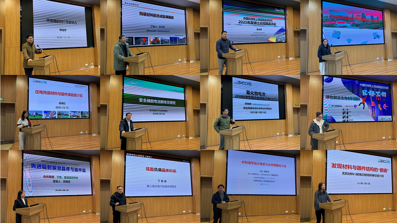 课题组招聘推介环节是本次会议的重点内容。来自结构陶瓷与复合材料工程研究中心、信息功能材料与器件研究中心、人工晶体研究中心、能源材料研究中心、生物材料与组织工程研究中心、新材料中试研发中心、无机材料分析测试中心的12个科研团队依次作介绍。各合作导师代表分别从课题组研究方向、科研团队构成、现有科研项目、实验平台条件及博士后岗位需求等方面进行详细推介,招聘需求涵盖热管理材料、压电材料与器件、激光晶体、闪烁晶体、储能电池、生物材料、材料表征技术等多个研究领域。
