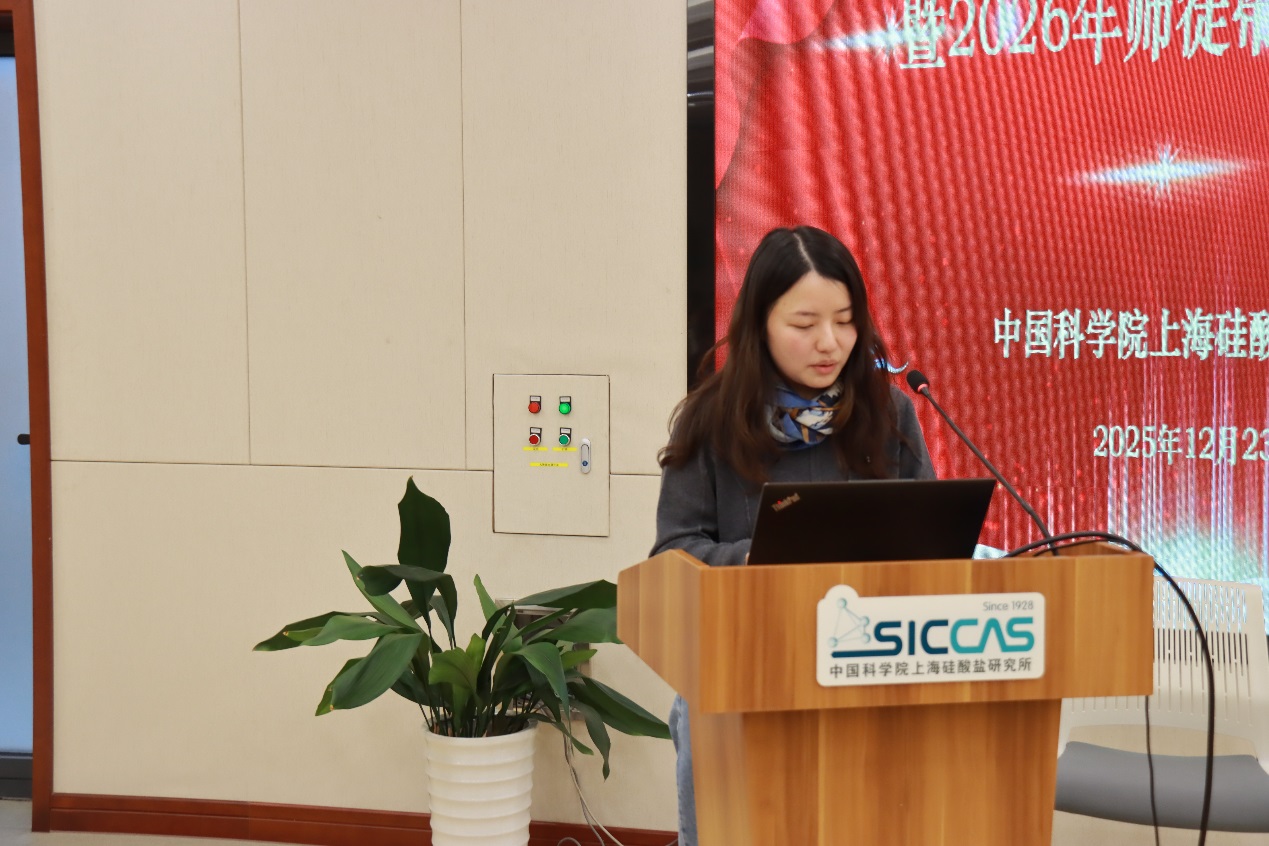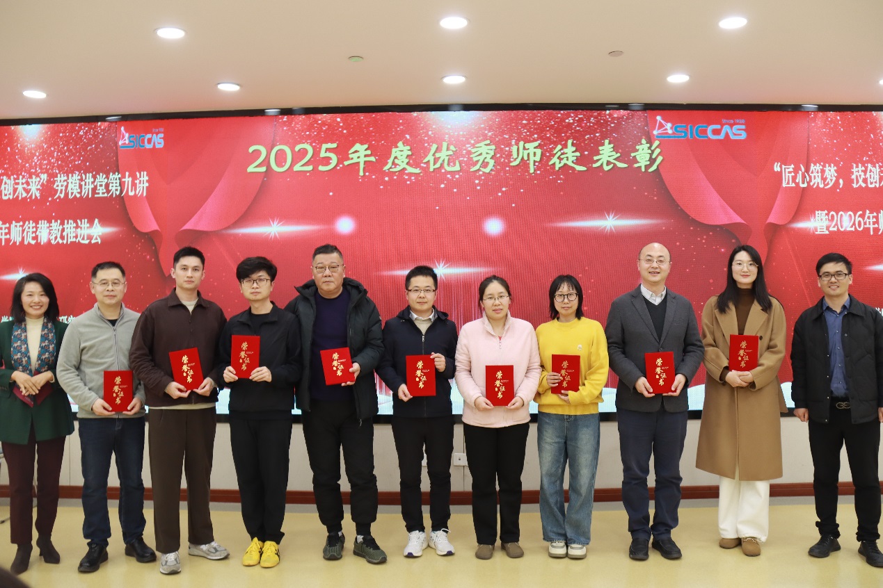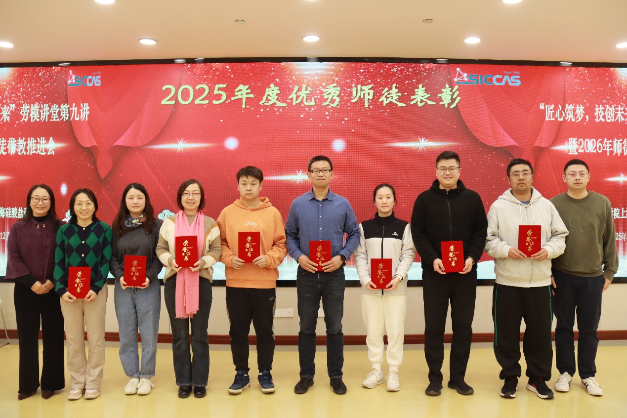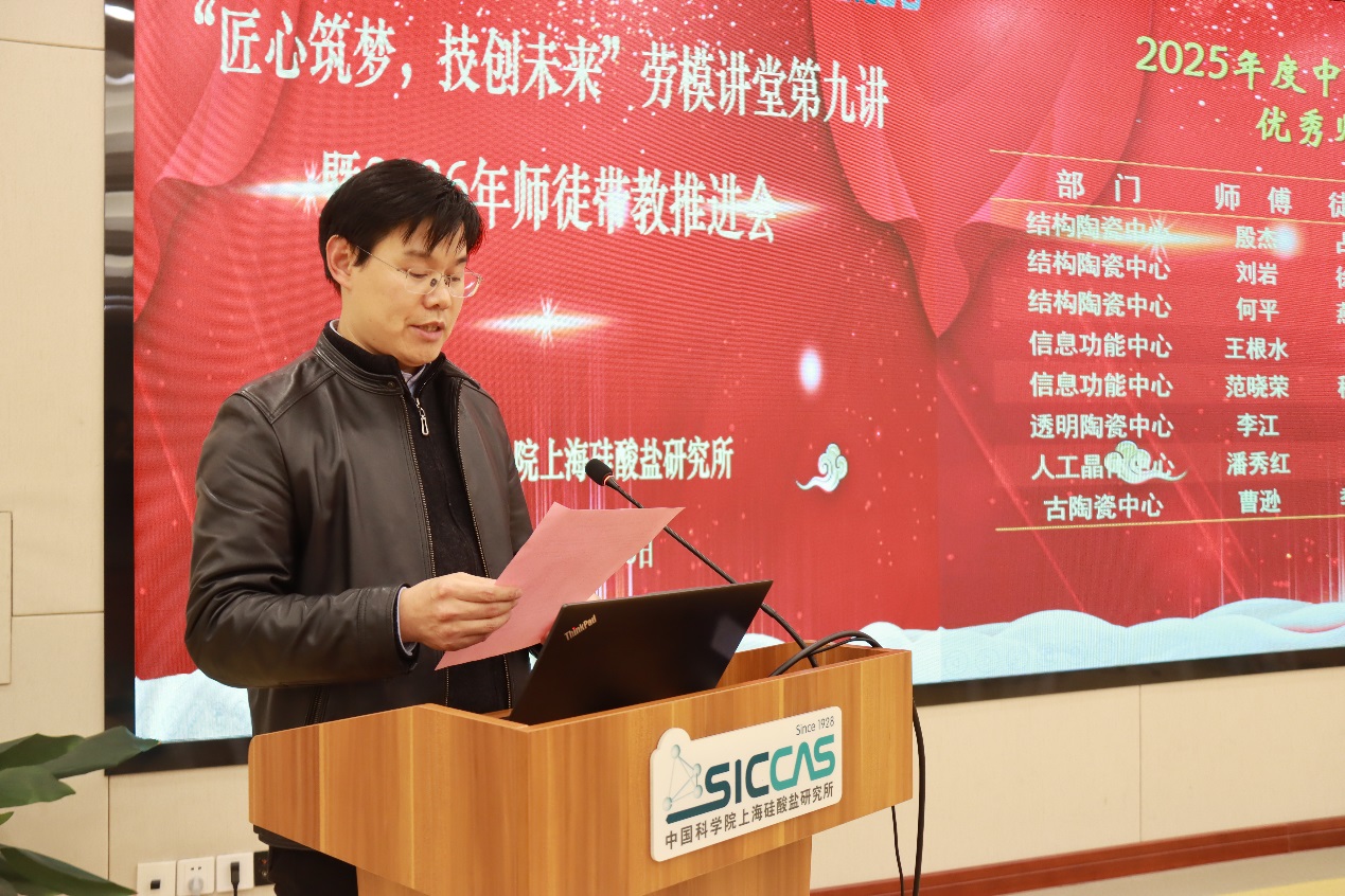刘学超宣读了2025年度优秀师徒表彰决定,所工会委员章俞之,古陶瓷与工业陶瓷工程研究中心主任、党支部书记曹逊,特种无机涂层研究中心党支部书记孟佳,新材料中试研发中心党支部书记袁兰英,机关三党支部书记、安全与保障管理办公室副主任宋桂兰,前沿基础研究部副主任、关键陶瓷材料全国重点实验室第一党支部书记林翰为16对优秀师徒颁奖。