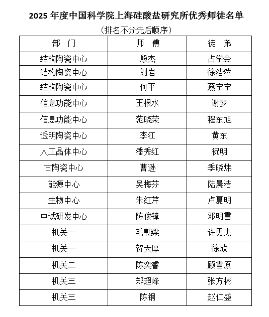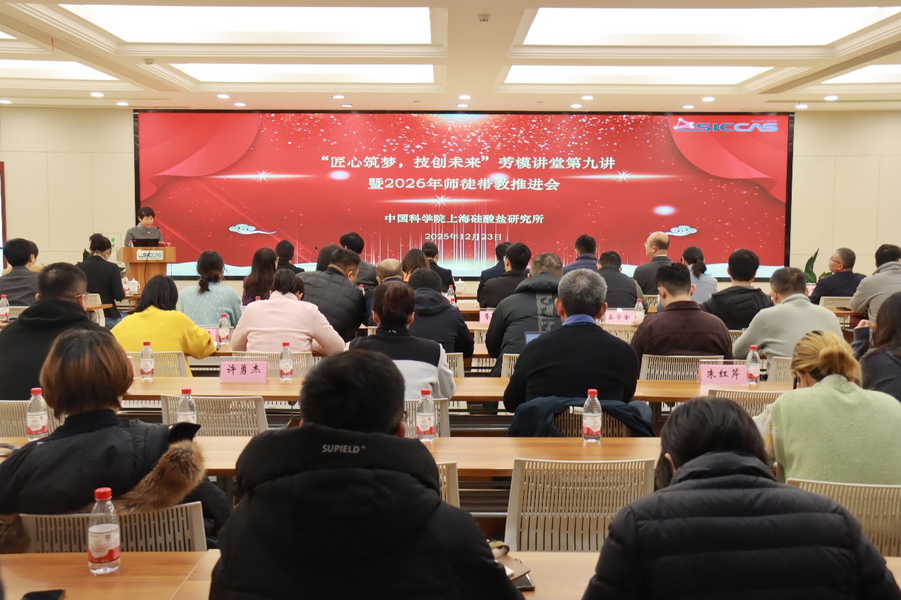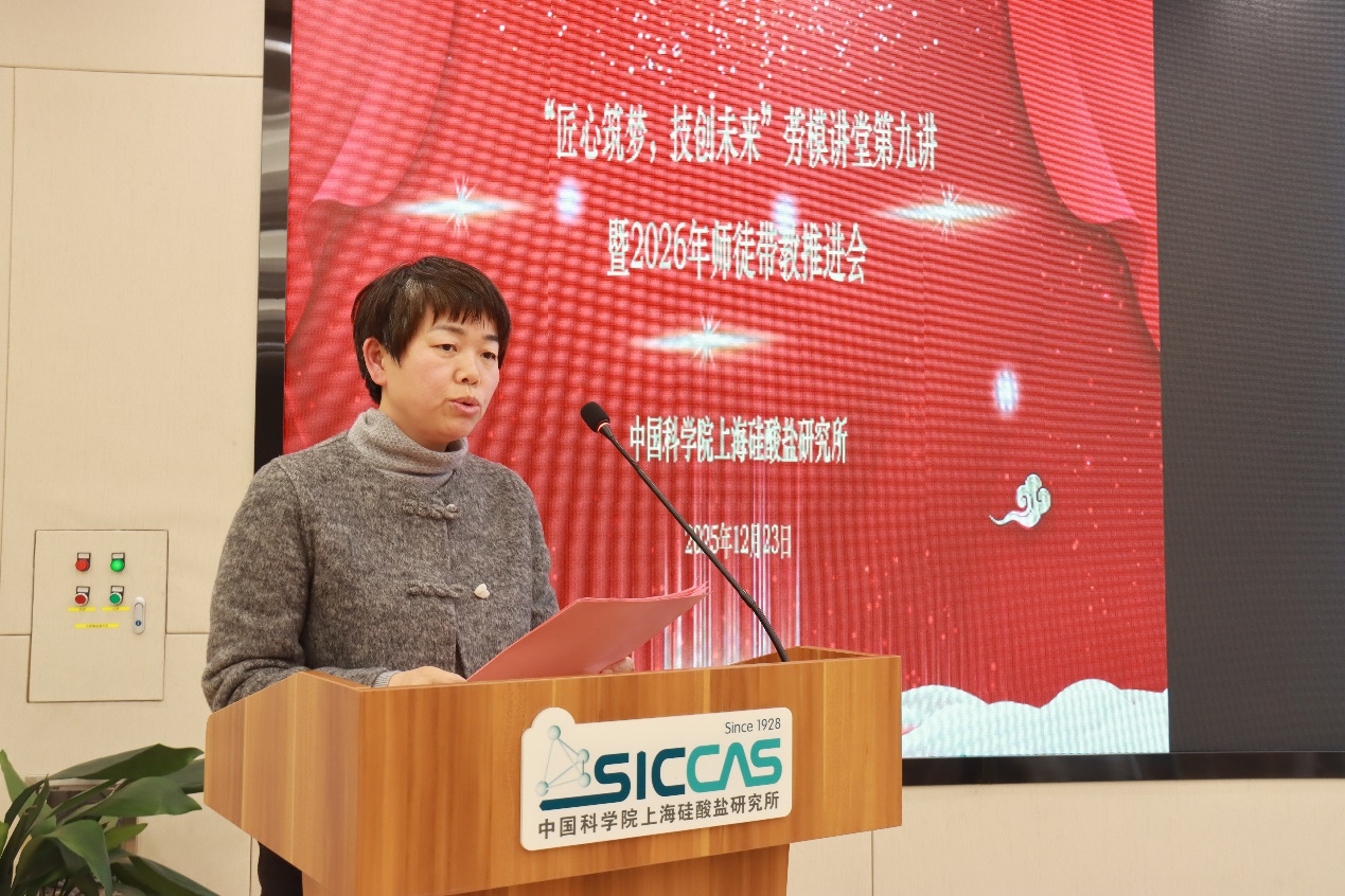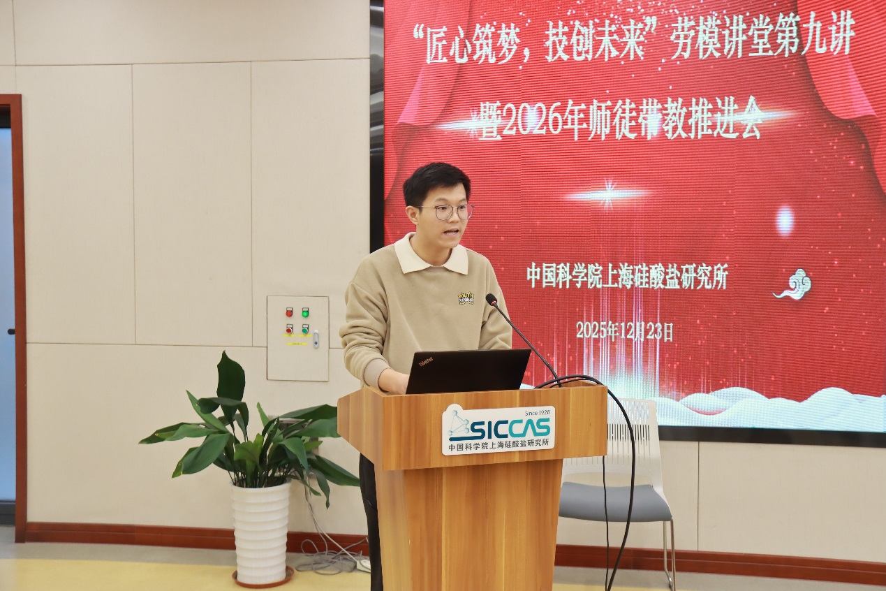 刘学超宣读了2025年度优秀师徒表彰决定,所工会委员章俞之,古陶瓷与工业陶瓷工程研究中心主任、党支部书记曹逊,特种无机涂层研究中心党支部书记孟佳,新材料中试研发中心党支部书记袁兰英,机关三党支部书记、安全与保障管理办公室副主任宋桂兰,前沿基础研究部副主任、关键陶瓷材料全国重点实验室第一党支部书记林翰为16对优秀师徒颁奖。
