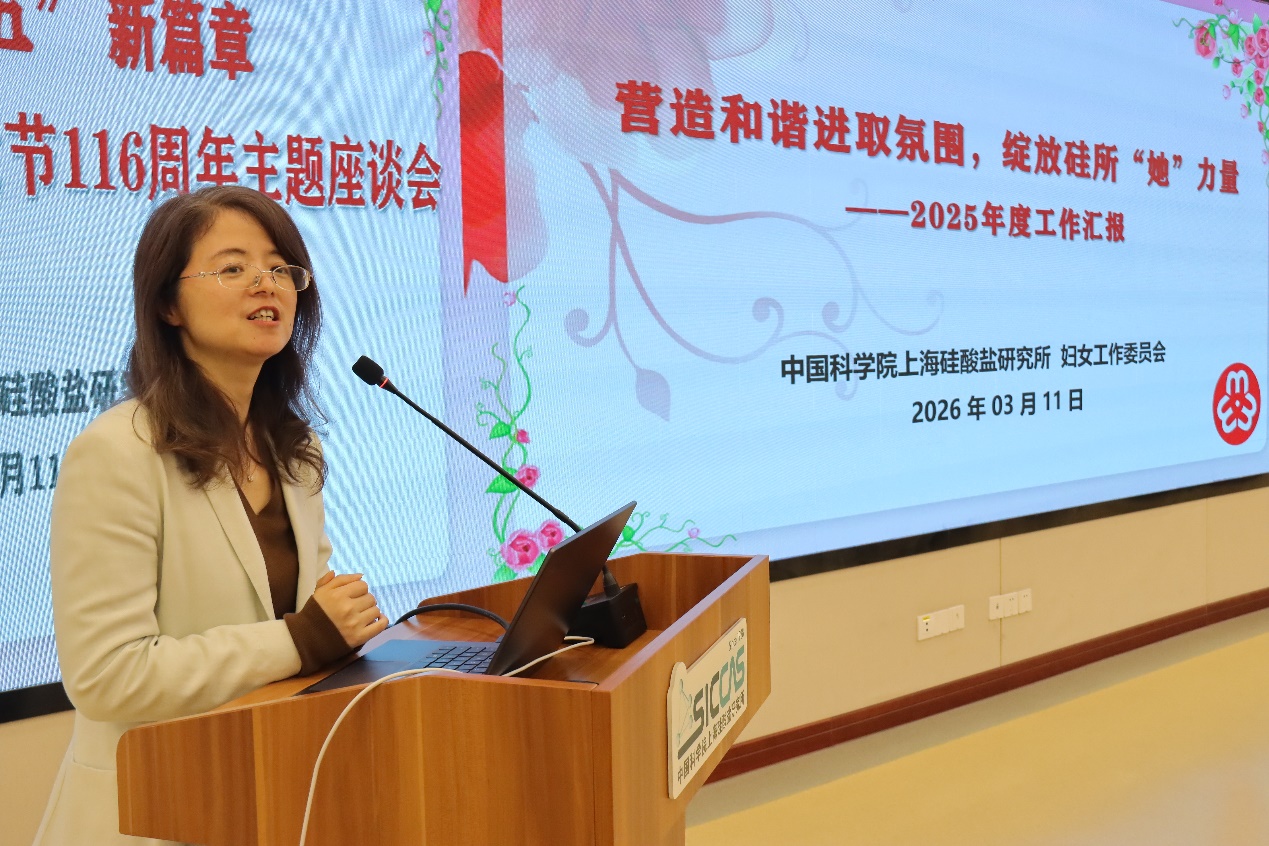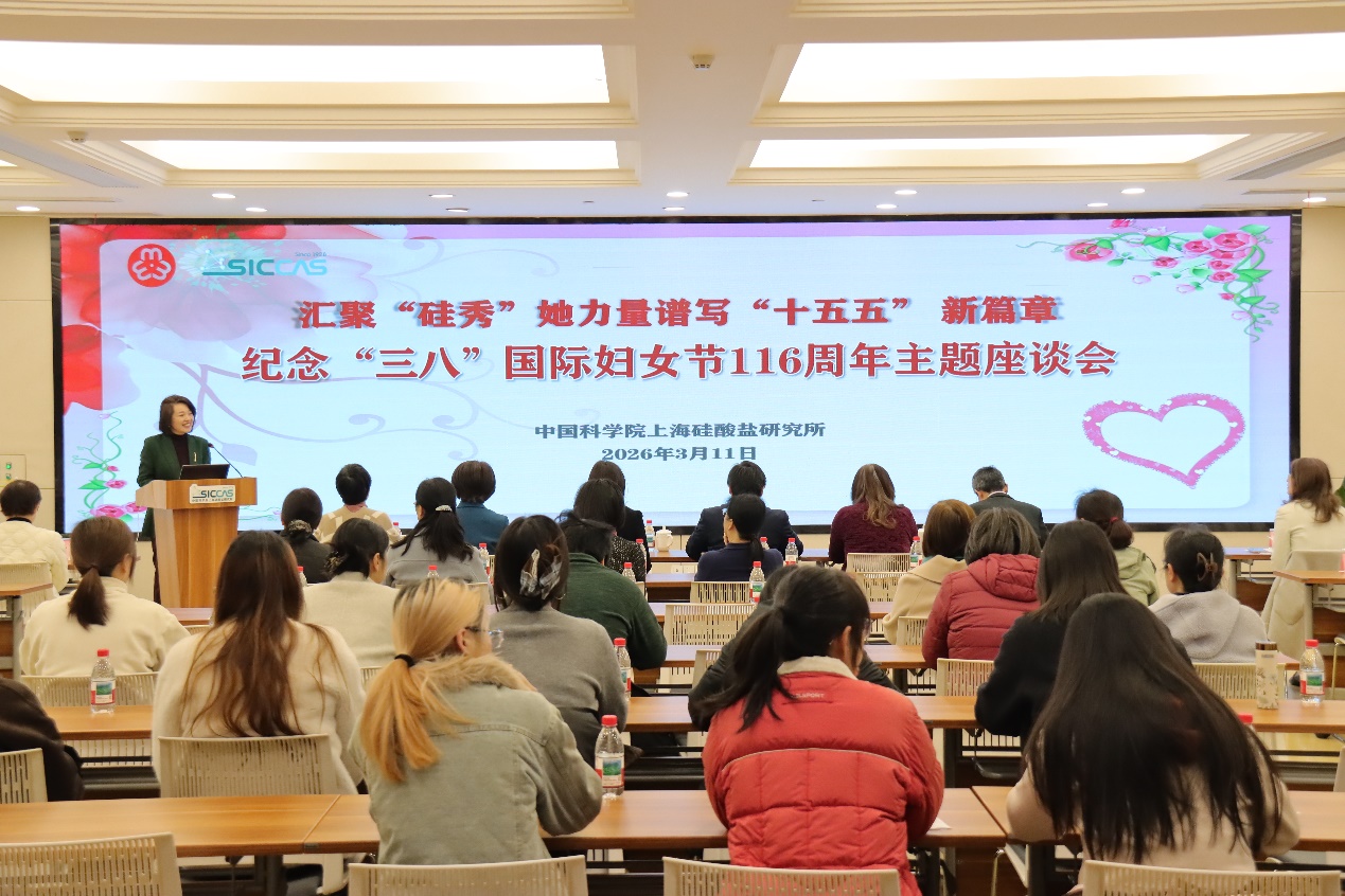 3月11日上午,中国科学院上海硅酸盐研究所妇女工作委员会召开纪念“三八”国际妇女节116周年主题座谈会。本次会议以“汇聚‘硅秀’她力量,谱写‘十五五’新篇章”为主题,深入学习贯彻中国科学院2026年度工作会议精神,表彰先进、分享经验、凝聚共识,进一步激发全所女性科技工作者的创新活力与奋斗热情。上海市科技妇工委主任何晌艳,全国妇联执委、中国科学院上海分院妇委主任、中国科学院上海药物研究所研究员柳红,嘉定区妇联主席姚芳,上海硅酸盐所纪委书记、党委委员周田华,党委委员、所务委员、党委办公室主任、所办公室主任毛朝梁,工会主席孙伟嬿,以及所妇委委员、女职工代表、女研究生代表等60余人出席会议。会议由妇委副主任袁兰英主持。