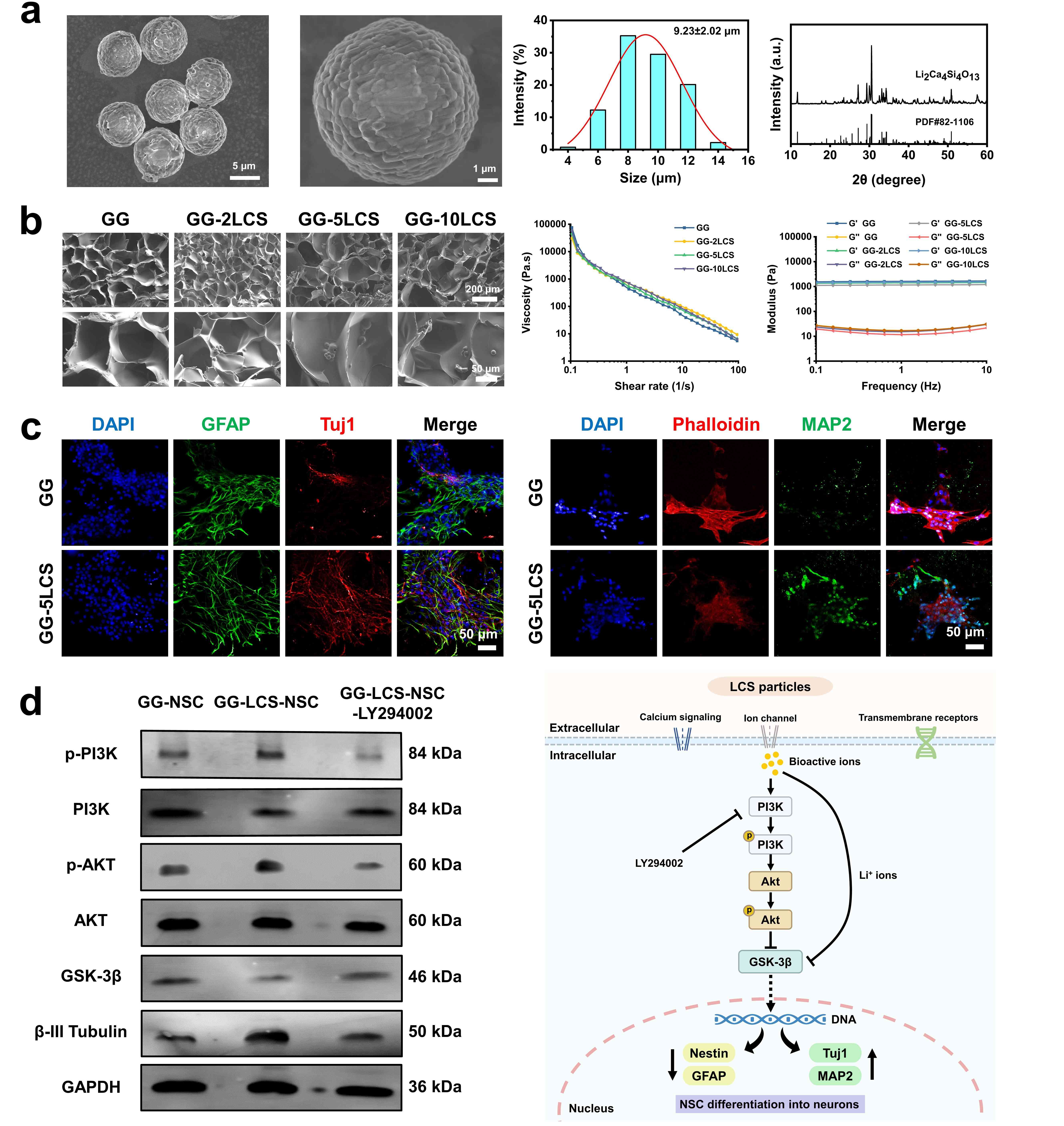 图2. 神经构建体的制备与表征。(a)Li-Ca-Si生物陶瓷的形貌、粒径分布与物相组成;(b)LCS基生物墨水的形貌与流变学特性;(c)神经构建体的体外生物活性;(d)LCS调控神经分化的生物学机制。